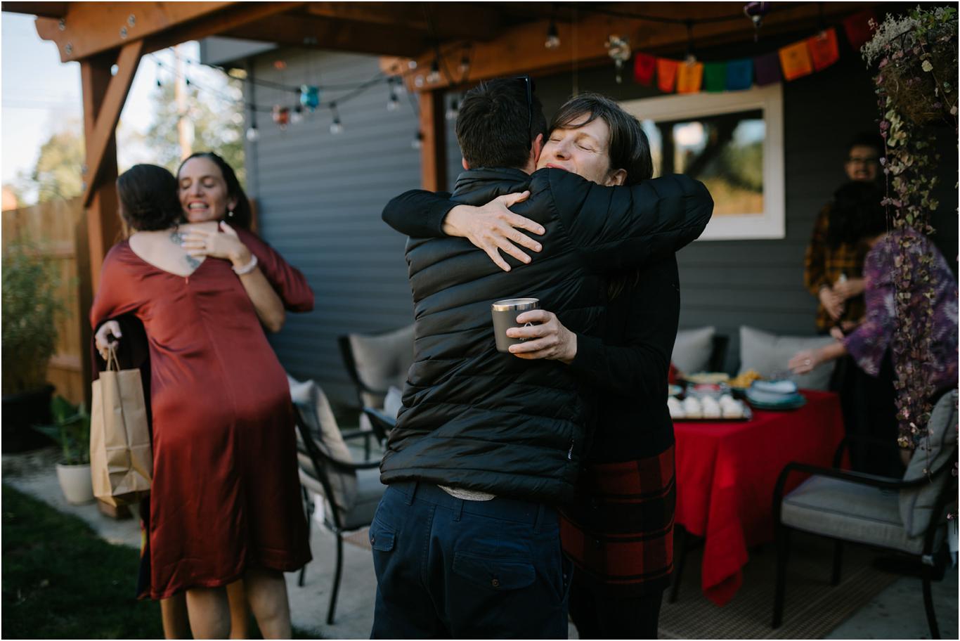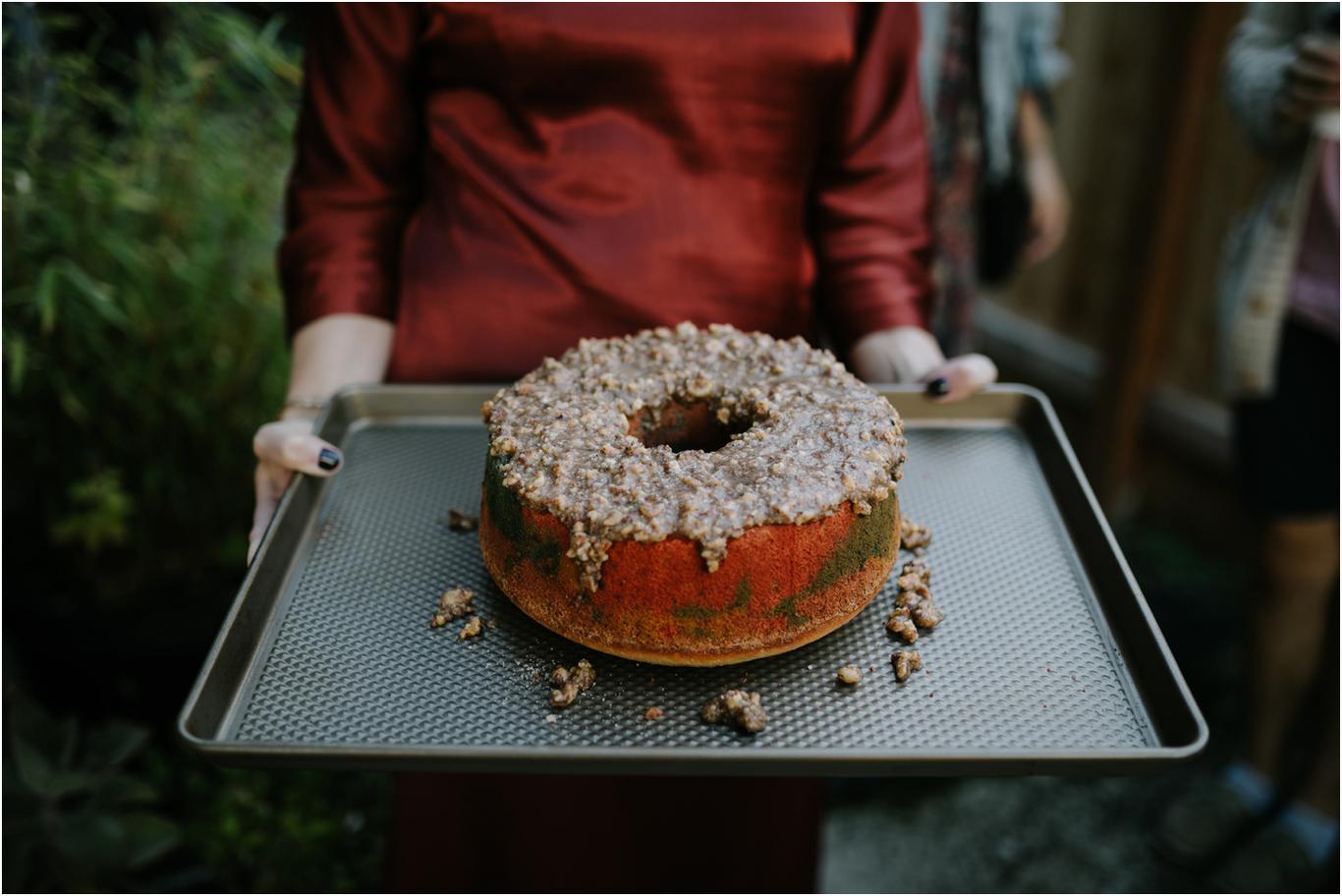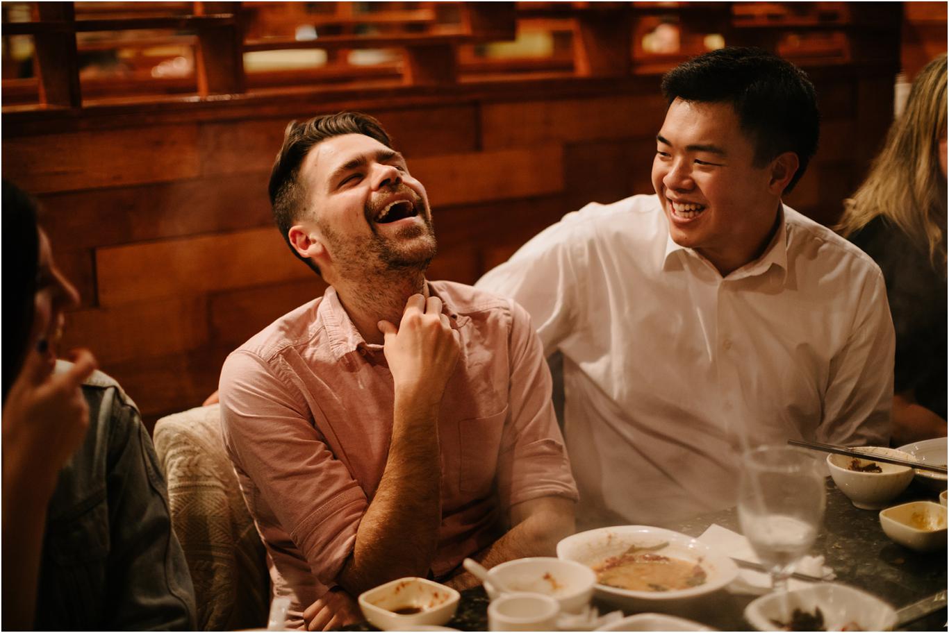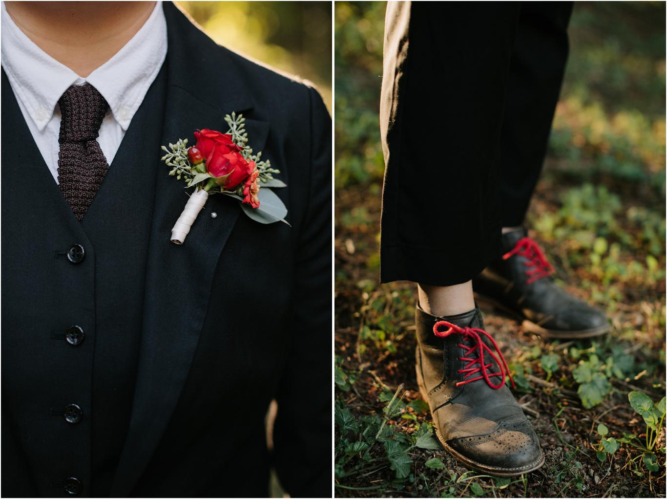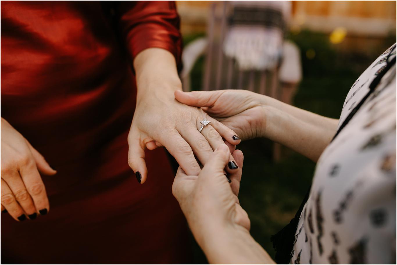 After scheming a bit, Cissey and Marya came up with the perfect plan. They decided to have an intimate Portland elopement in the forest at Pier Park. The park is just down the street from their house, and they go there all the time together! They got ready together that morning, then hosted cocktails and snacks in their backyard before walking over to the forest for their ceremony. We took a ton of pictures amongst the tall trees, then spent a little more time hanging out at their house, eating cake, giving toasts and enjoying the crisp fall weather before dinner. Finally, as it got dark, we set off to Little Sheep, a Mongolian Hot Pot restaurant in Beaverton! It was SO them and such a unique and fun way to end the day with a huge, long meal! I was SO happy I got to be their Portland same sex wedding photographer, as well as a guest!