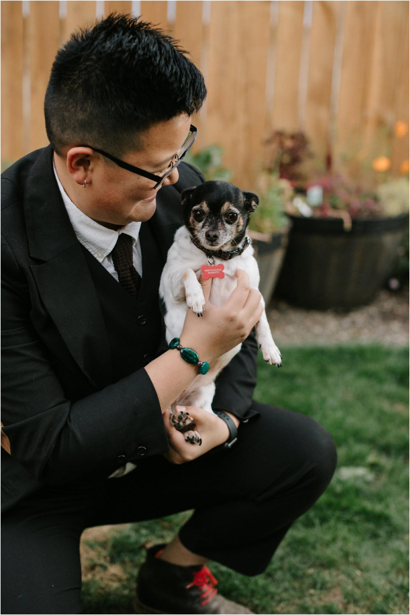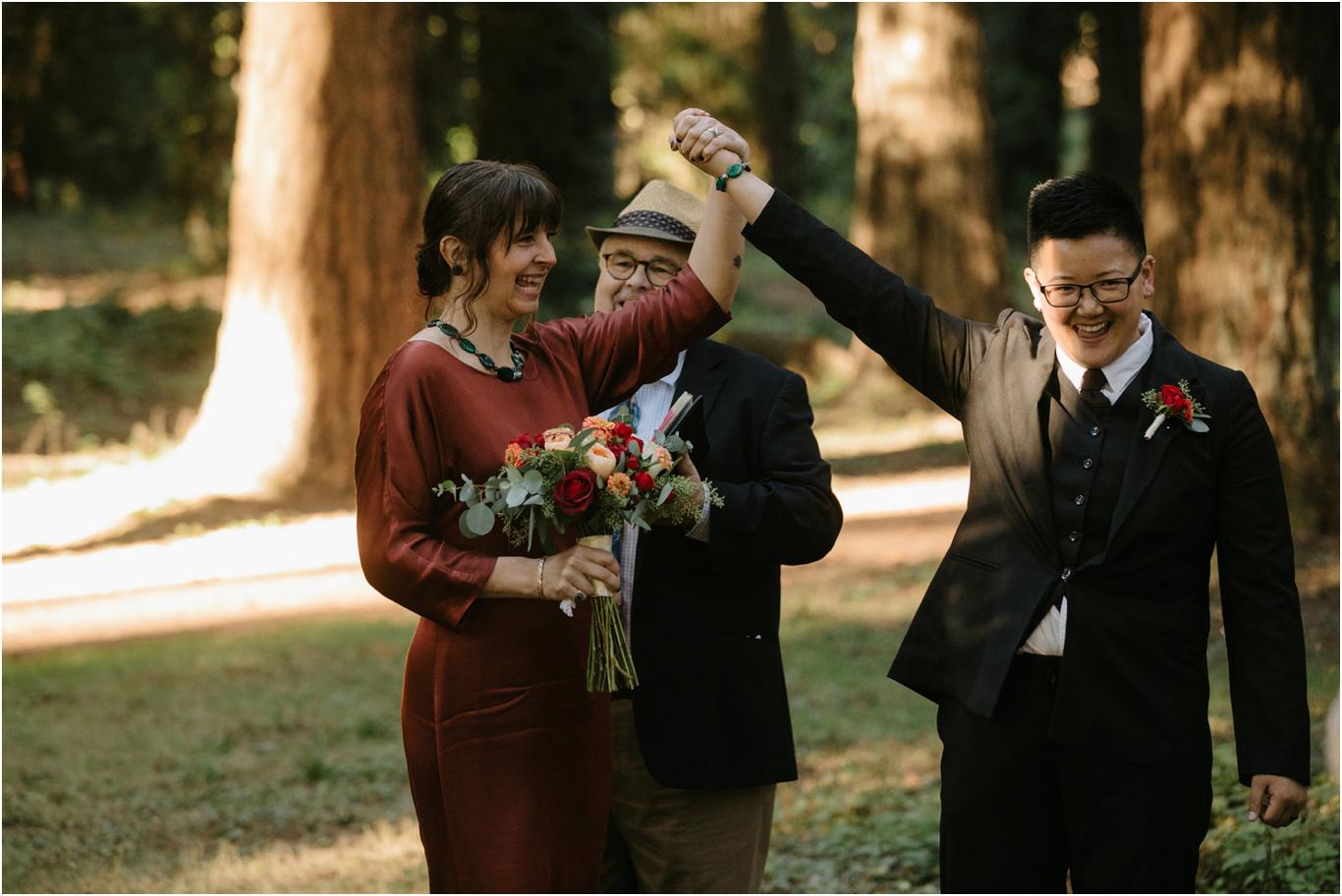 Marya and Cissey described their ideal date night as going bouldering, then inhaling shredded beef tacos after 10pm from Rose City Taqueria in St Johns, followed by cuddles with their dogs and watching trashy TV (while Marya’s knitting for a loved one/dog and Cissey’s playing video games). They also love to go bargain hunting for organic food at Grocery Outlet, subjecting their dogs to silly outfits, and going to u-pick farms for fruit, veggies and gardening inspiration! On their wedding day, they were most excited about sharing their vows in front of their family and friends in an epic, yet intimate, nature setting. They wanted the day to feel joyful, intimate and natural and it 100% was!! I cried like a baby after their ceremony and it was an absolute honor to be their Portland same sex wedding photographer after knowing them for all these years!!