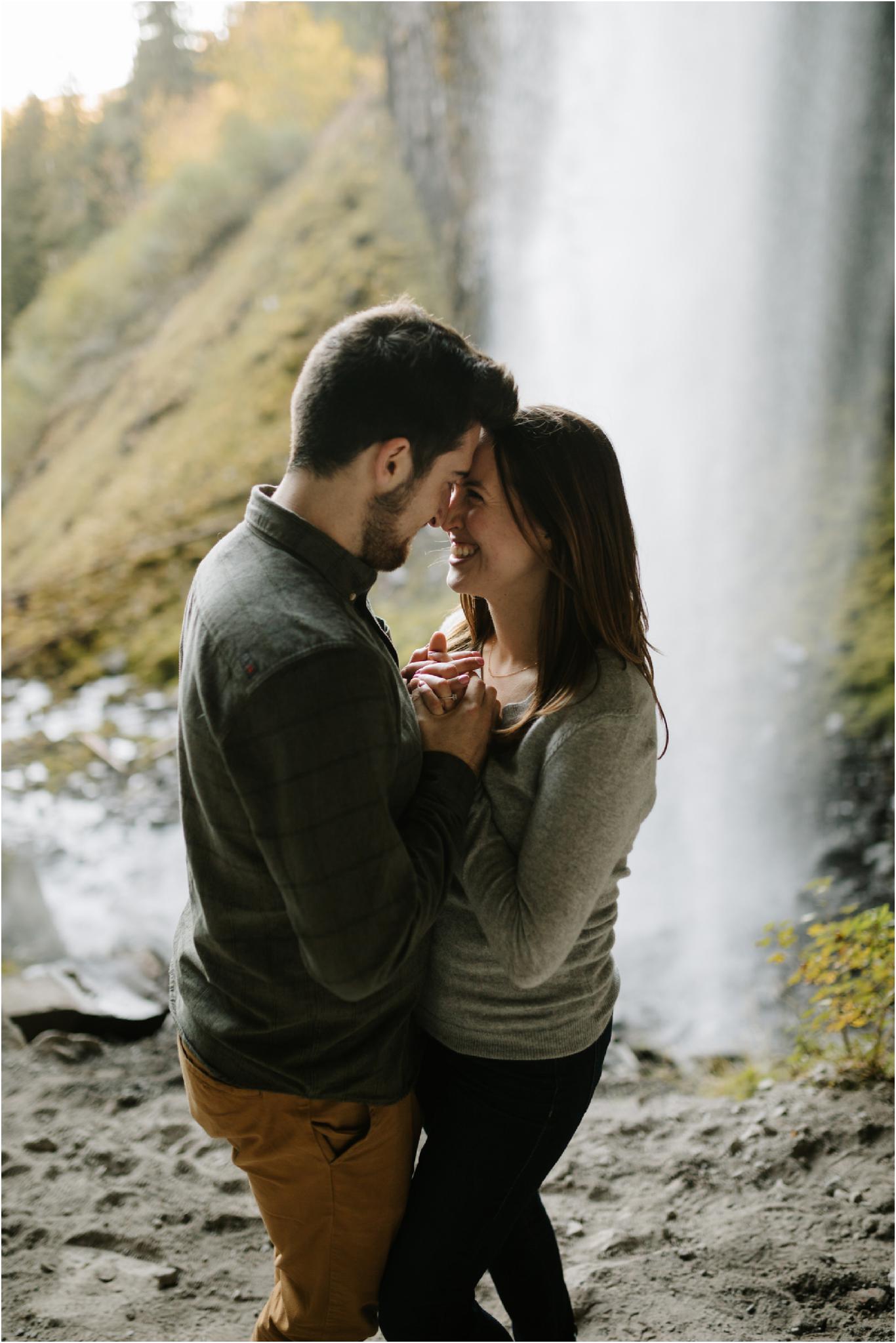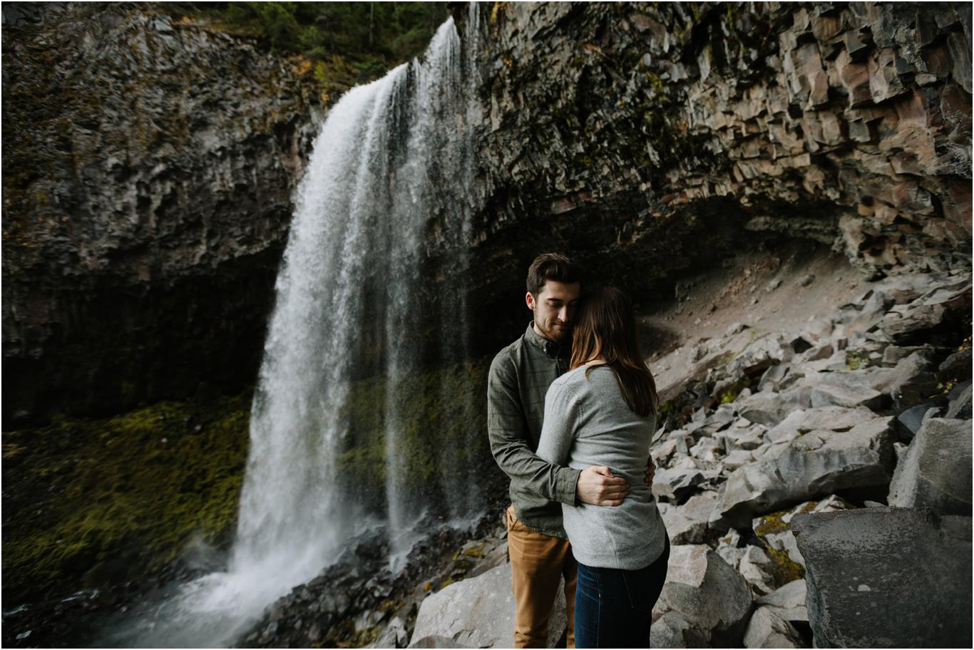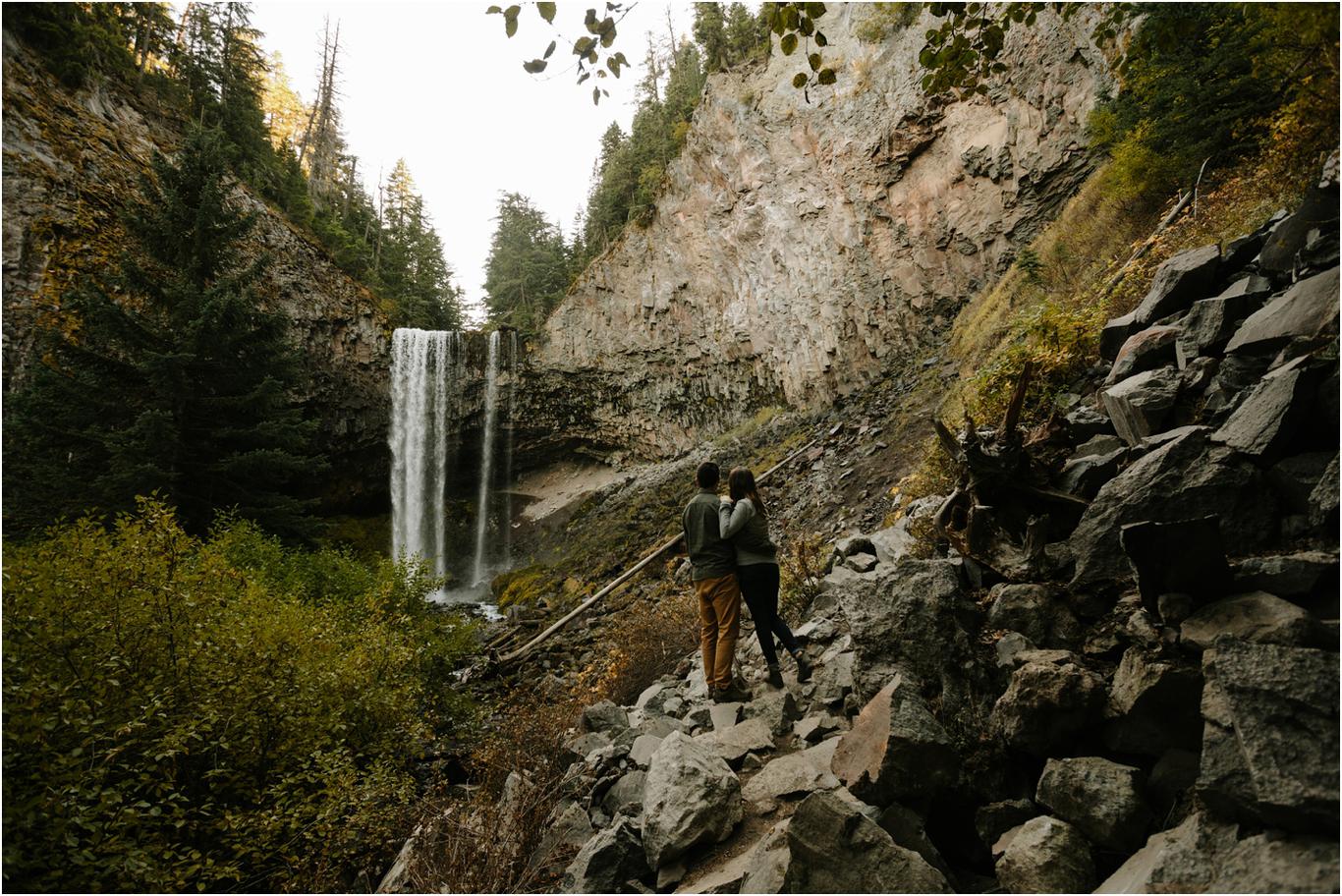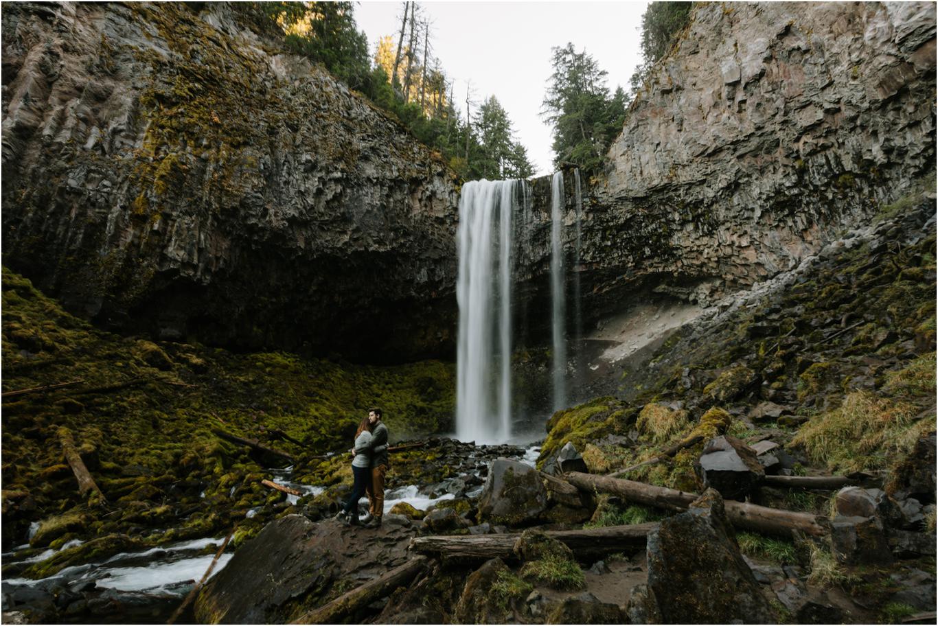 Marisa’s sister told them they were going out for happy hour and drinks, so they should get all dressed up and cute. Then her sister was like, let’s go take pictures outside before we leave! Then all of a sudden her dad walked up and there was Alex! She was so happy, and then she saw that his parents were there too and then she started getting emotional. He got down on one knee with both their families there and it was totally perfect. Family is super important to her so it was nice that he was able to surprise her and include them! I am SO excited to share their Tamanawas Falls engagement photos with you today! And I can’t wait to photograph their beautiful wedding next spring!