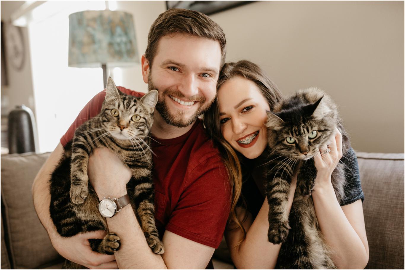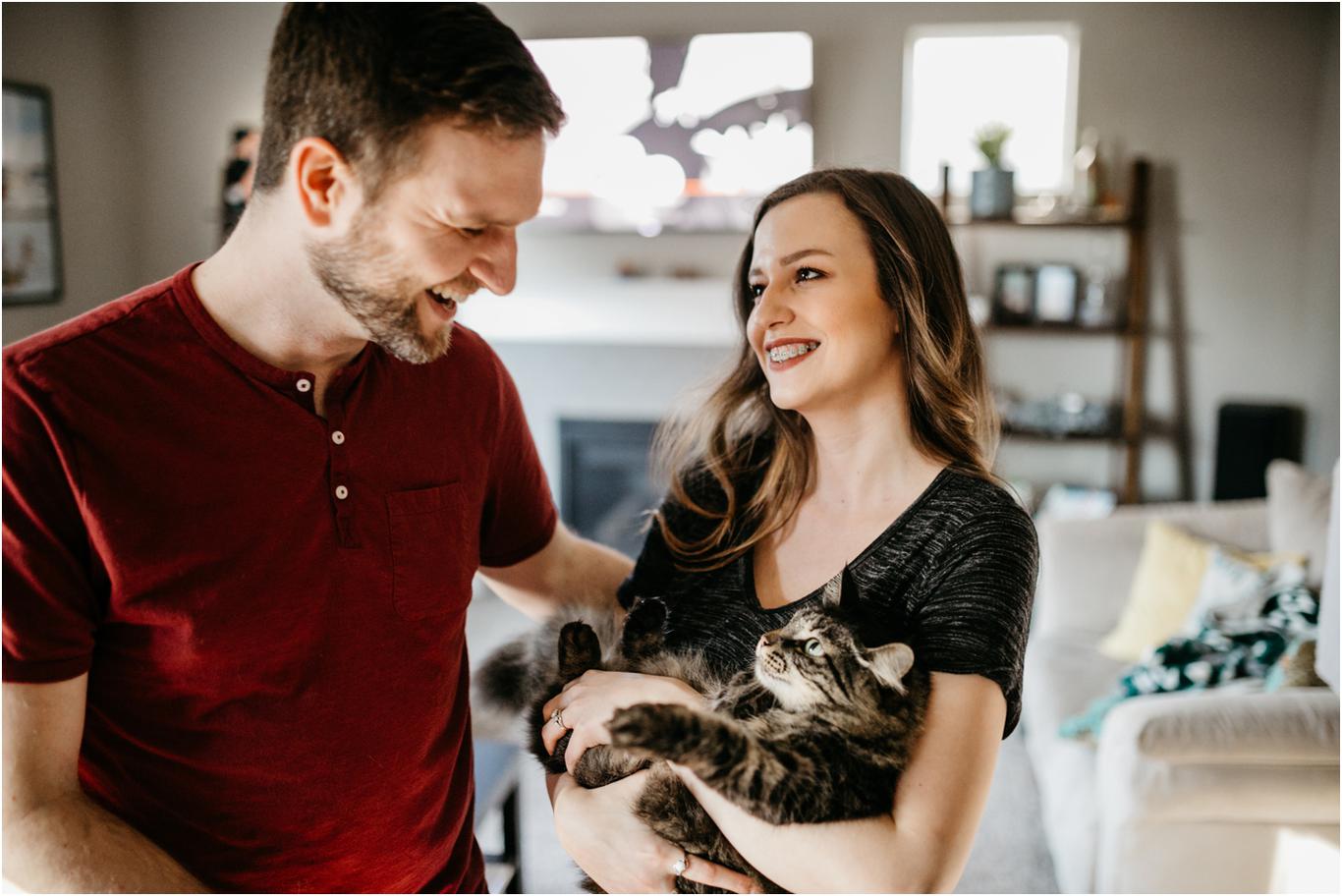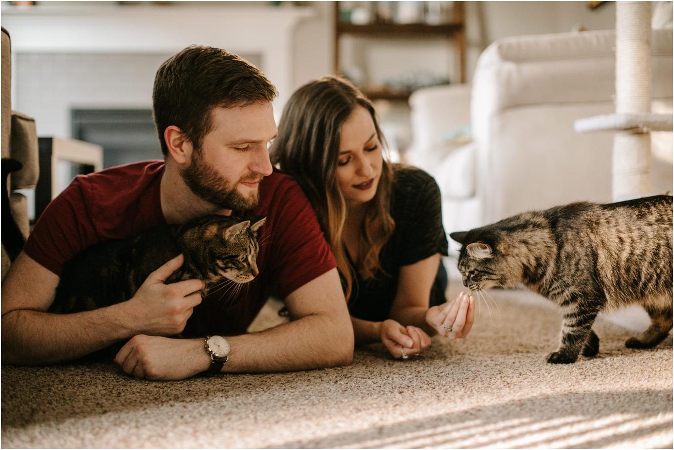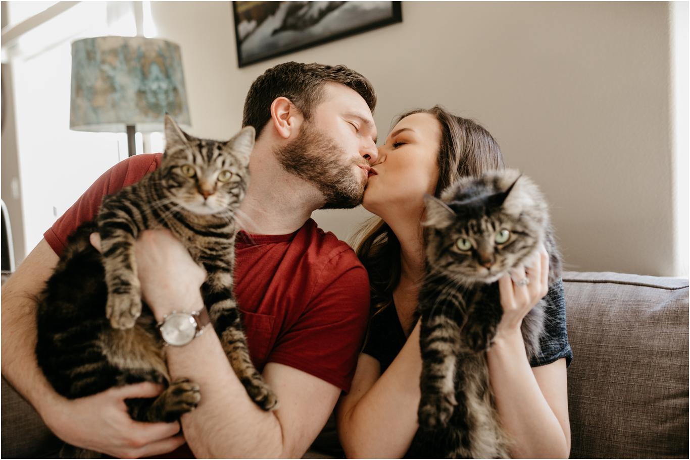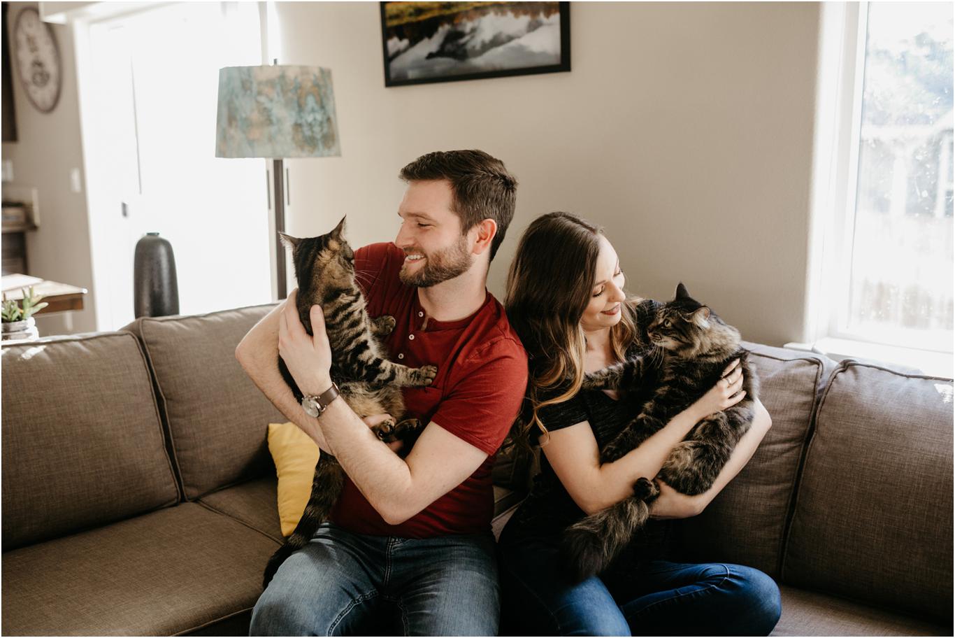 Your home is important. It says SO much about who you are and your relationship. Plus, your pets live there too! I often take Portland engagement photos at epic locations around the city or out in nature, but sometimes the most representative place to photograph people is in their own homes. That’s why I freaking LOVED these in home Corvallis engagement photos with cats!