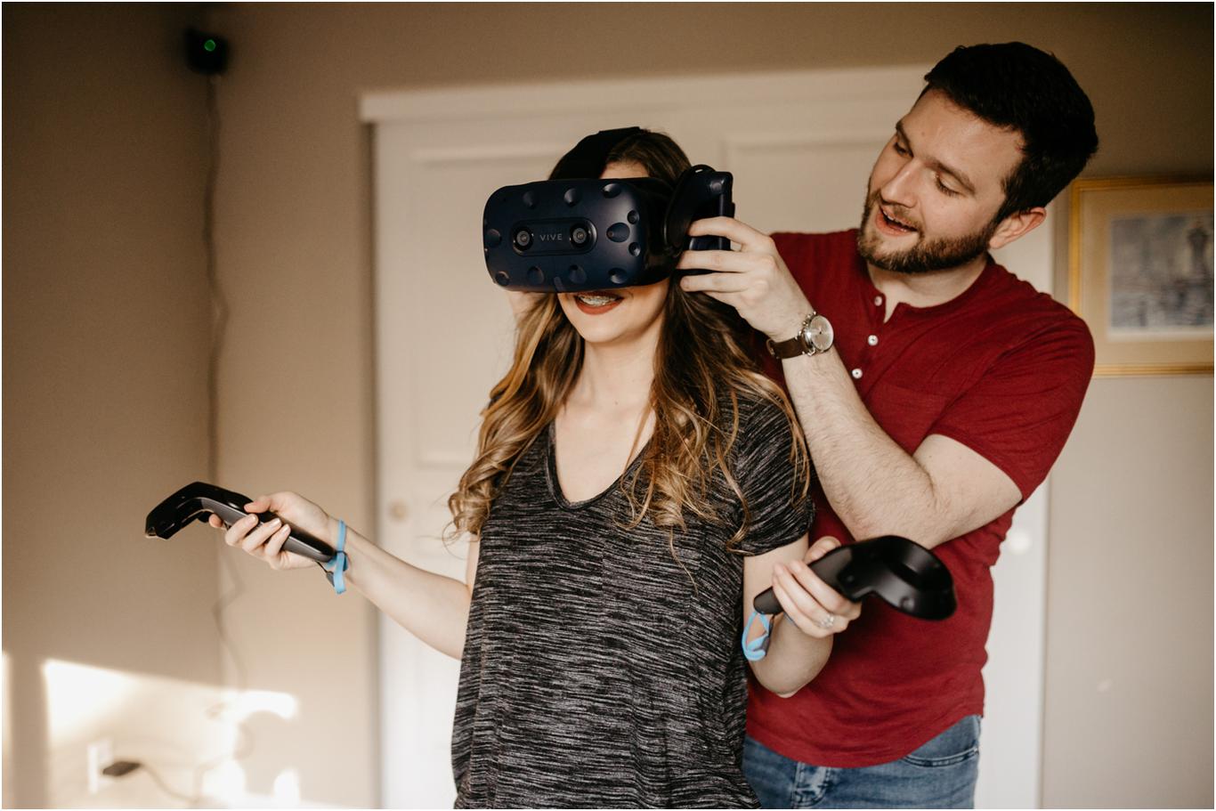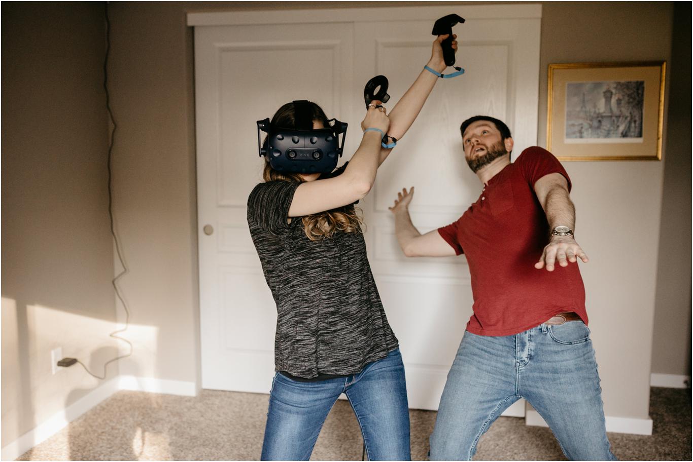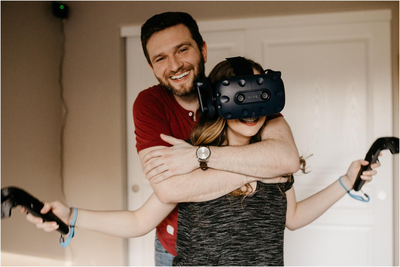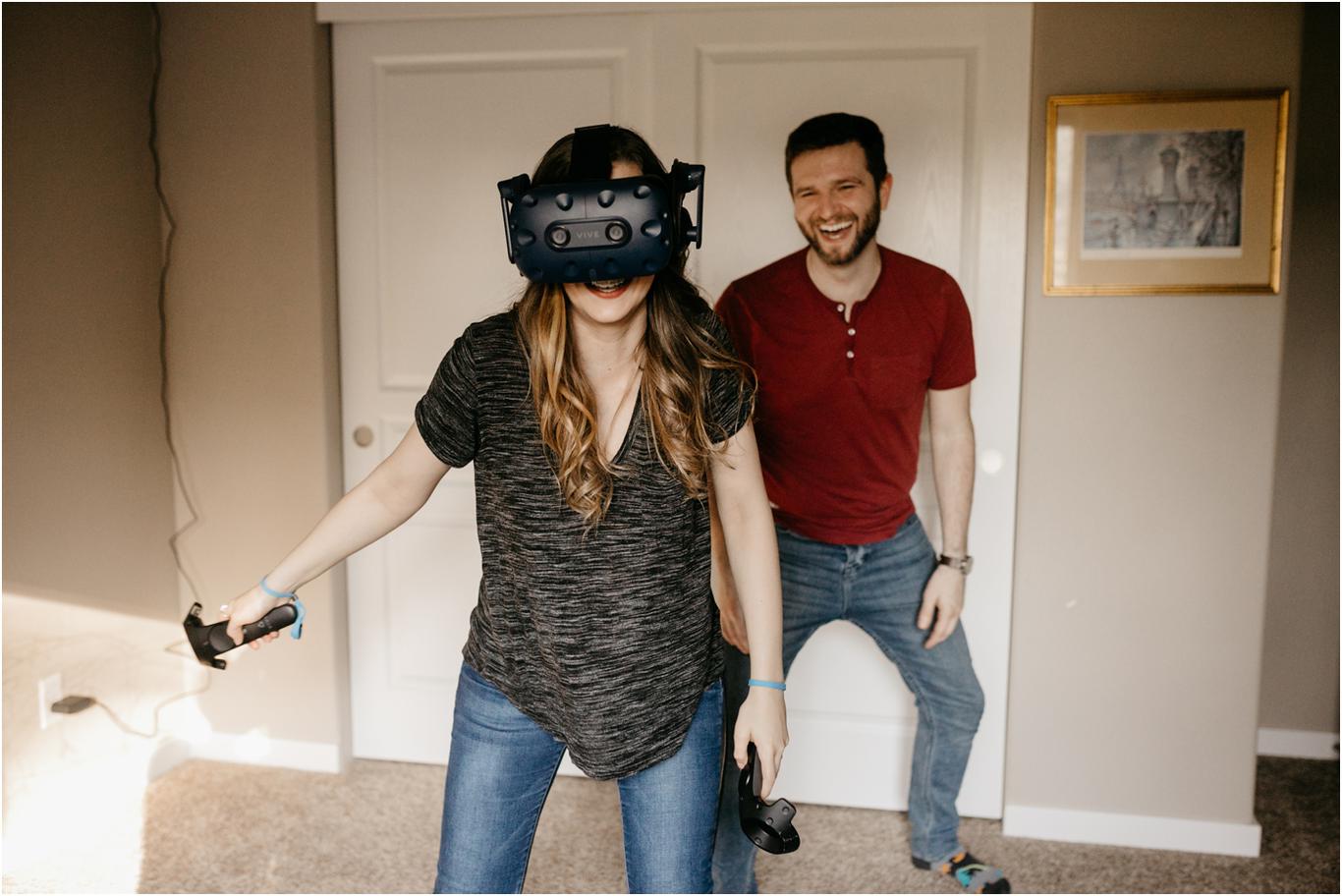 Dylan and Olivia have been friends of mine for many years now. I’ve probably known Dylan for like a decade, and when he met Olivia I was overjoyed because they just fit SO well together. I could tell that they both had the same playful energy with a deep understanding for each other. They also had so much in common! For instance, they are both bigtime cat lovers and video game nerds. Their house has a lot of space devoted to these particular things, so I was stoked that their engagement photos could be representative of their goofy, romantic, AND nerdy selves! When they told me that had recently turned a guest room into a virtual reality gaming room, I knew we had to take a few fun shots in there too. This whole set of in home Corvallis engagement photos with cats was so fun and playful!