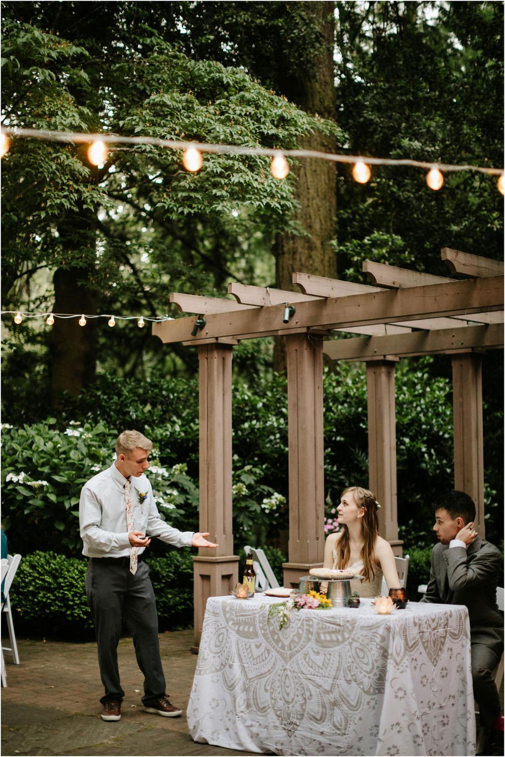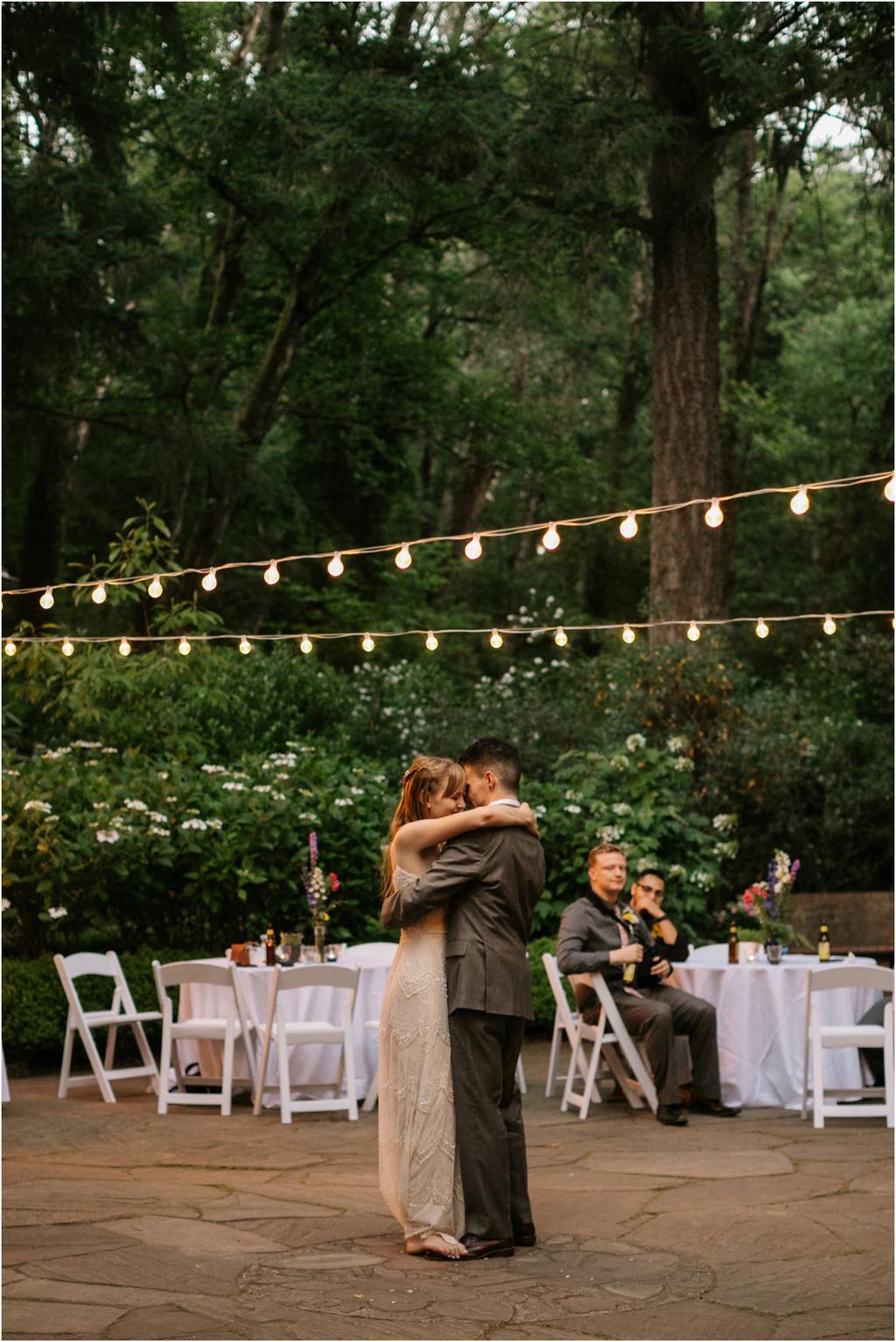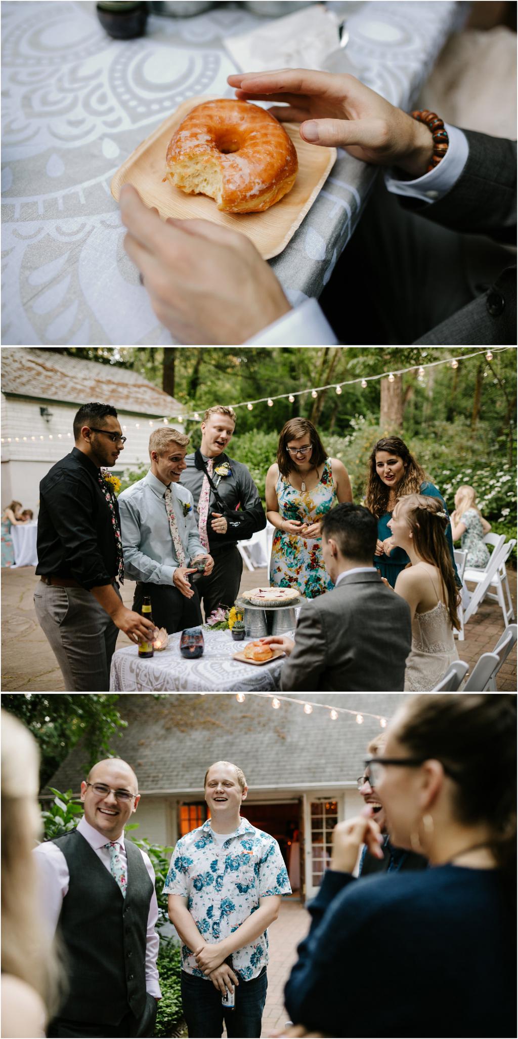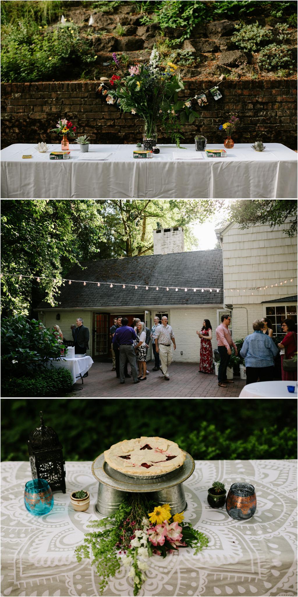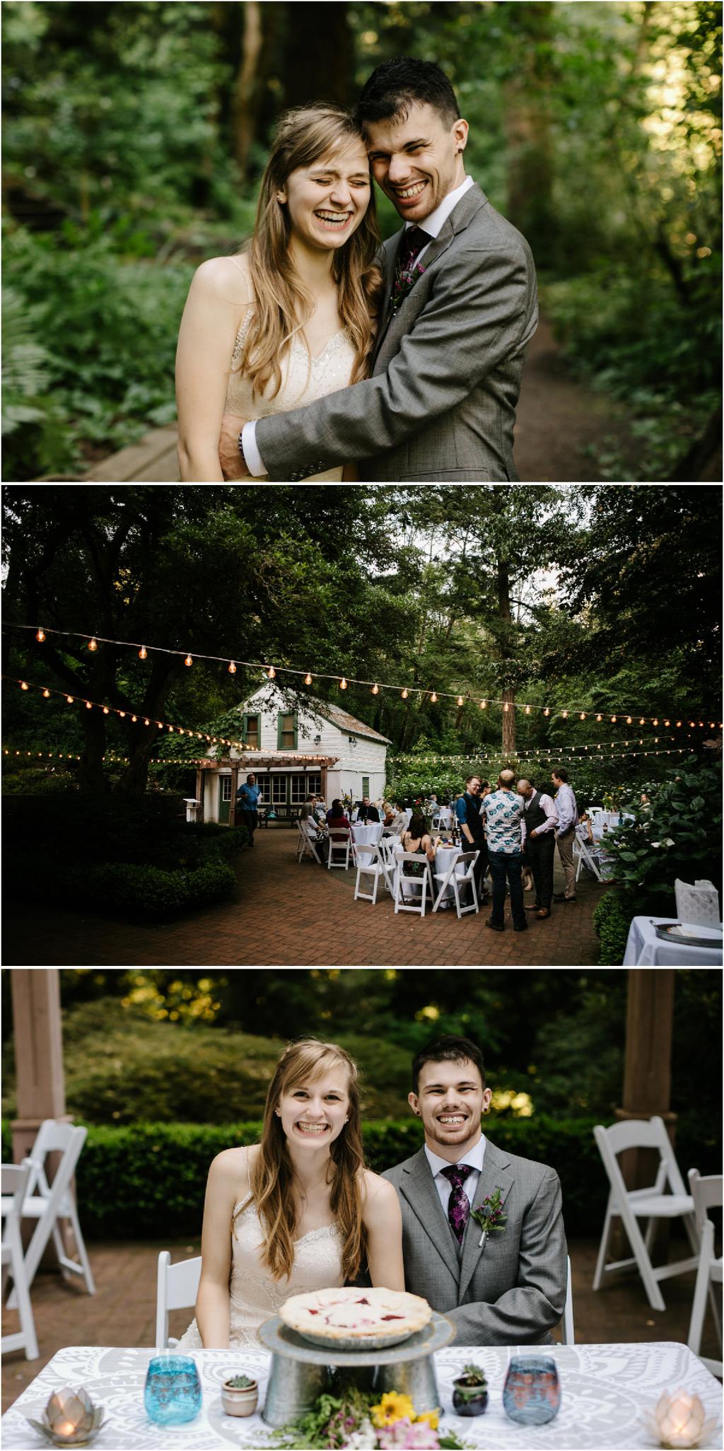 Venue: Leach Botanical Garden The Dress: Chic Nostalgia from the White Dress in downtown Flowers:ย ordered flowers from Portland Wholesale Florist, but made arrangements themselves S’Mores: S’mores from **Nineteen27 S’moresย ** Doughnuts: from Voodoo Beer and Wine: from **My Bartenderย ** Cold Brew Coffee: from **Coffee Timeย ** Kombucha: from **Townshend’sย ** Barefoot Sandals:ย handmade by bride’s aunt Menswear + website: **Men’s Warehouseย **