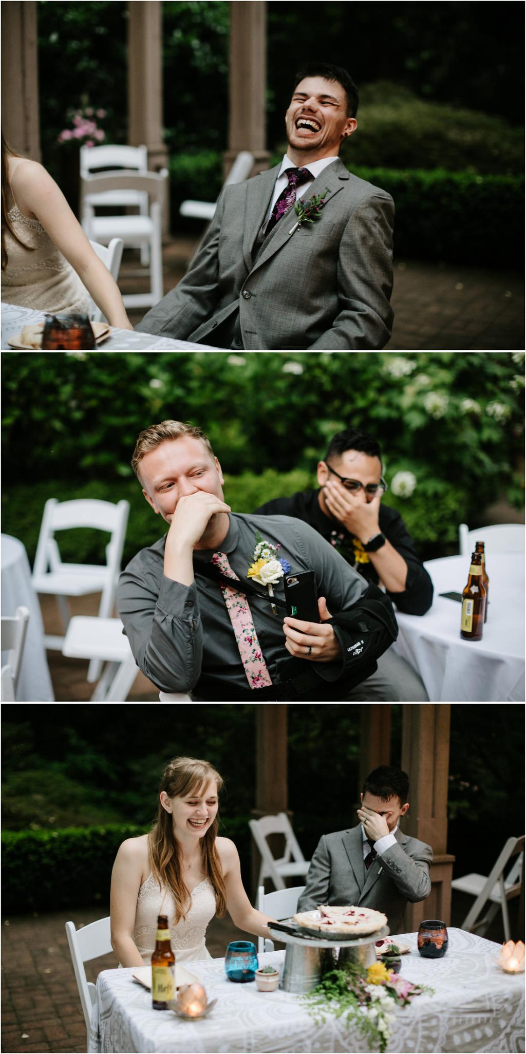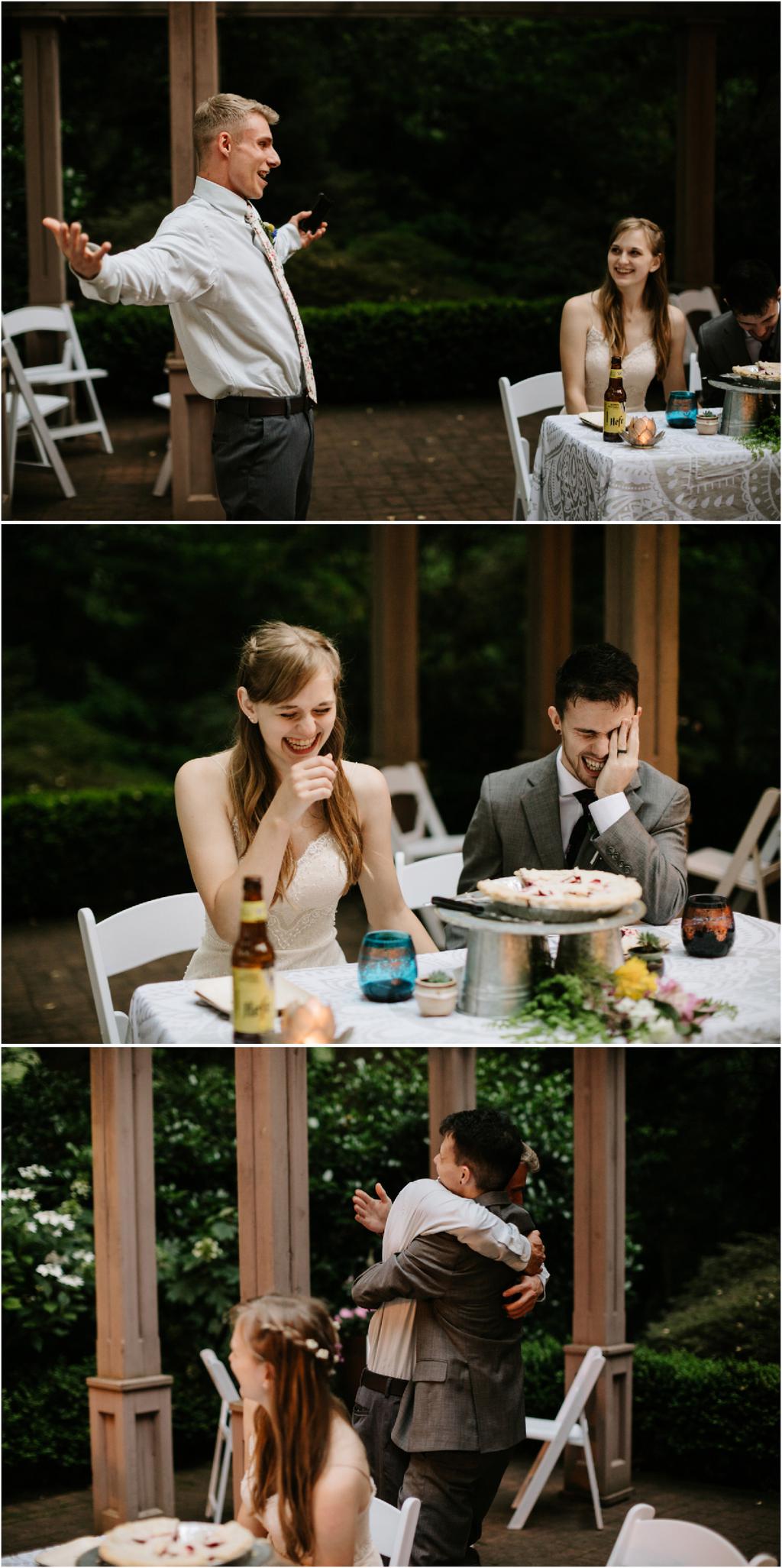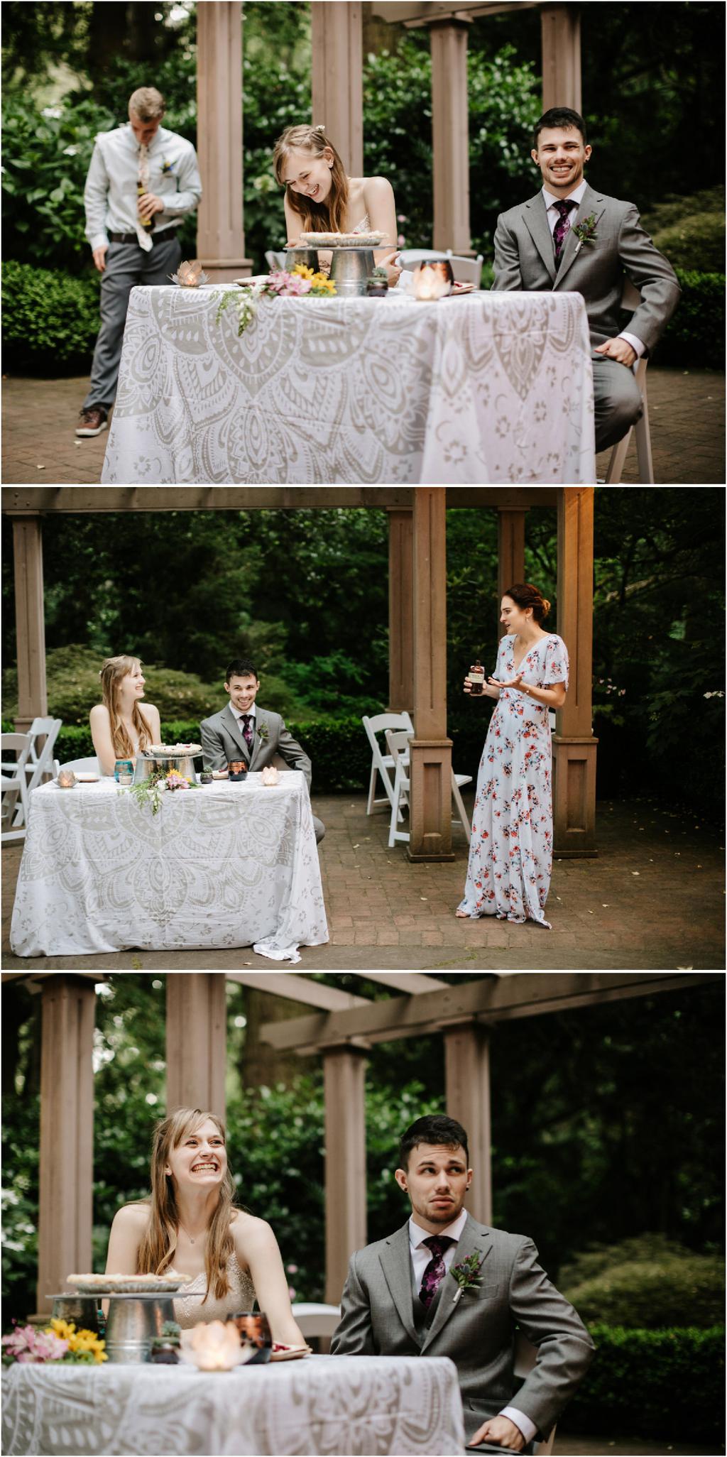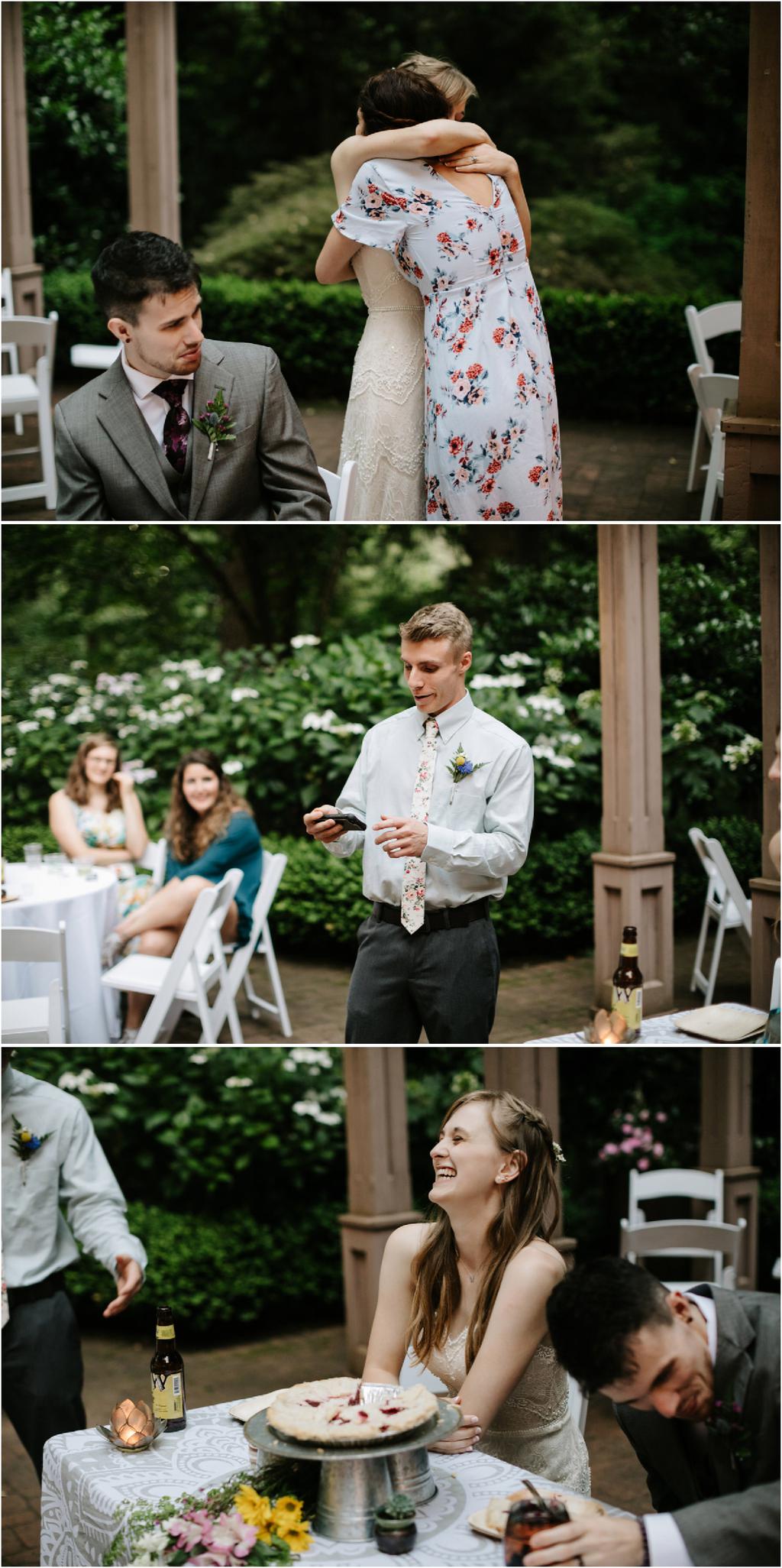 Venue: Leach Botanical Garden The Dress: Chic Nostalgia from the White Dress in downtown Flowers:ย ordered flowers from Portland Wholesale Florist, but made arrangements themselves S’Mores: S’mores from **Nineteen27 S’moresย ** Doughnuts: from Voodoo Beer and Wine: from **My Bartenderย ** Cold Brew Coffee: from **Coffee Timeย ** Kombucha: from **Townshend’sย ** Barefoot Sandals:ย handmade by bride’s aunt Menswear + website: **Men’s Warehouseย **