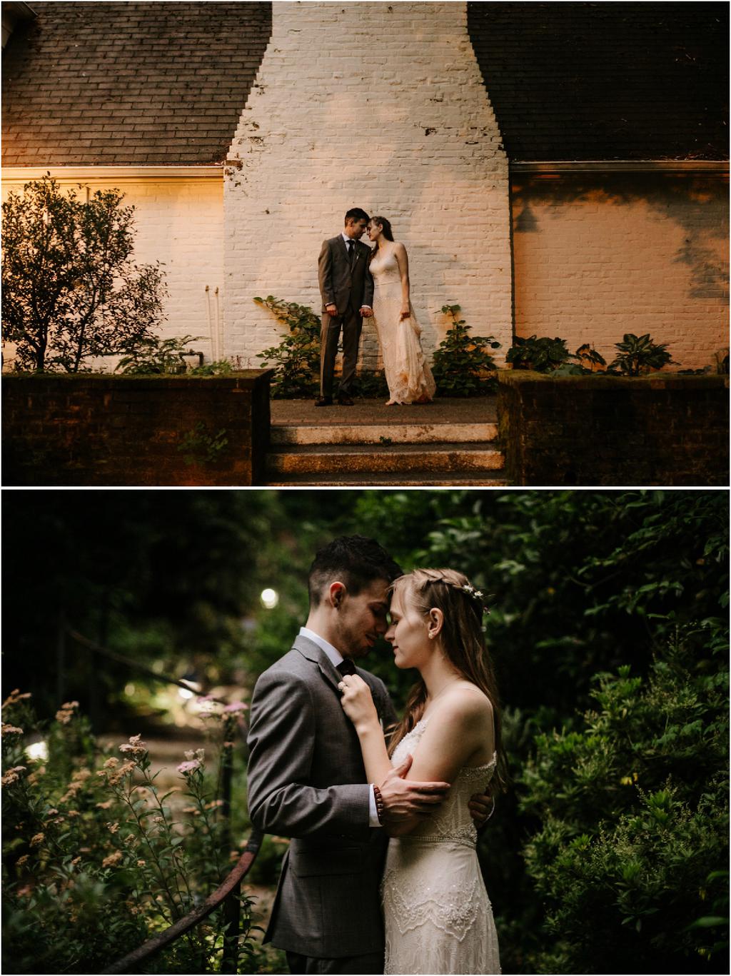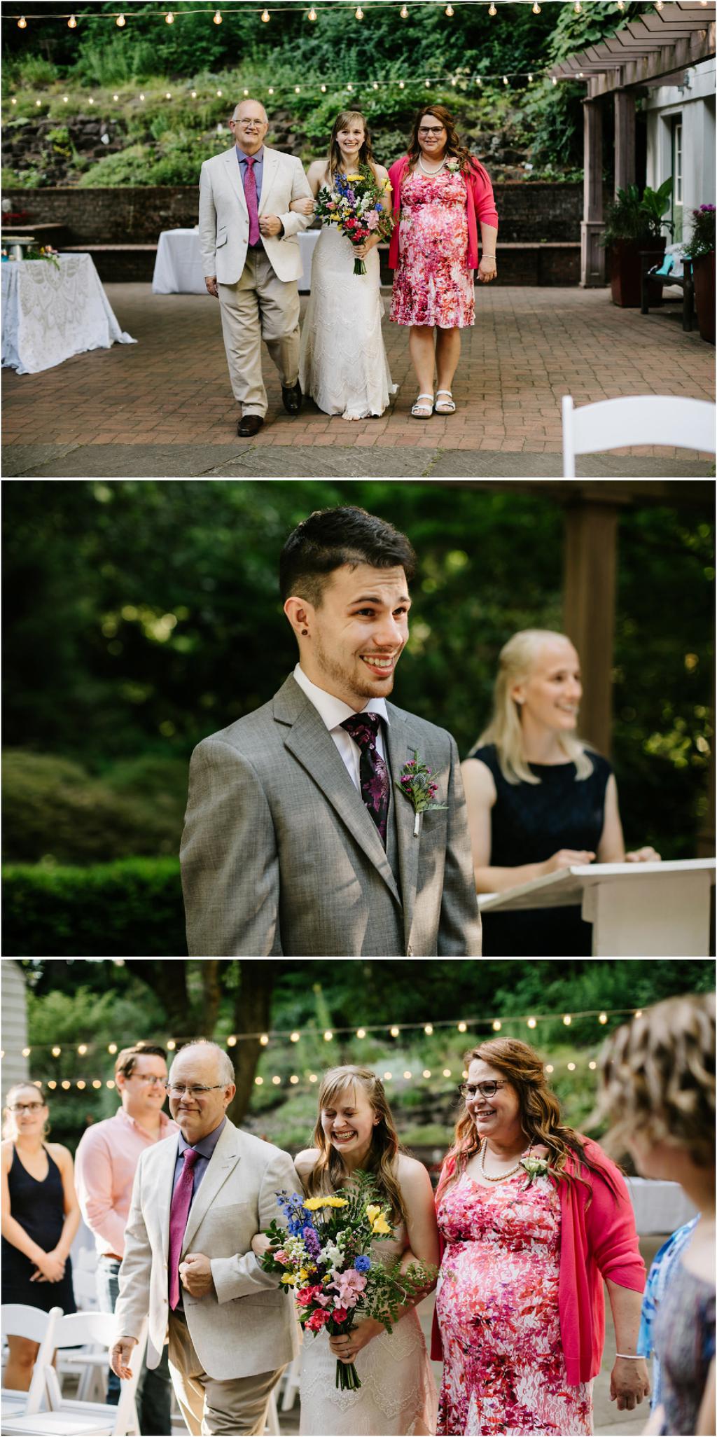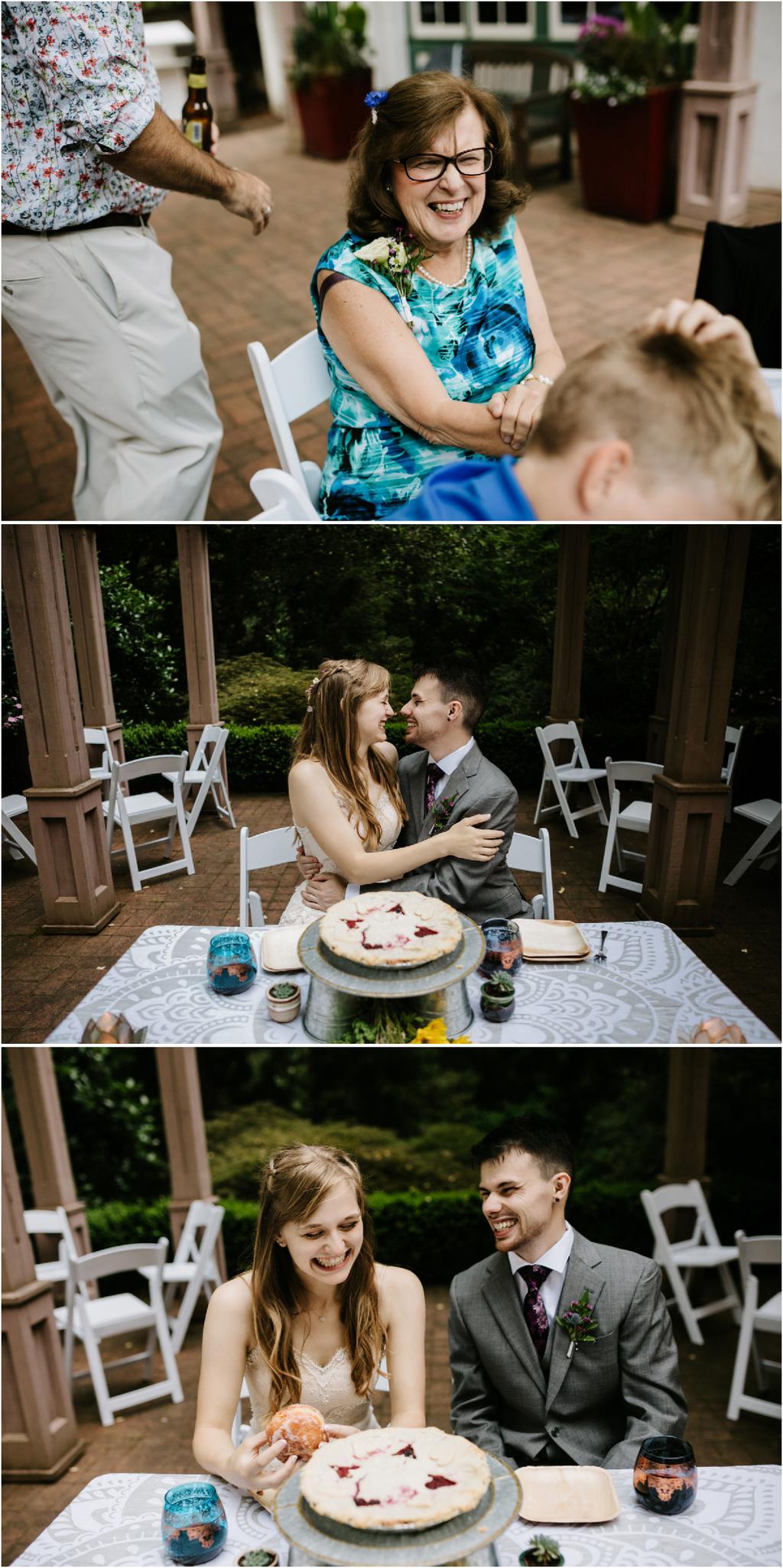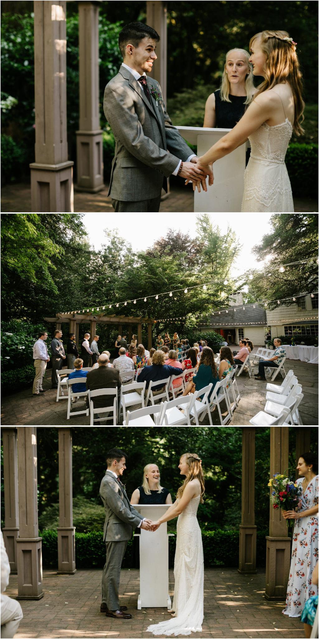 Their Leach Botanical Garden wedding started with pizza and ended with S’mores. Instead of serving a full dinner, Elizabeth and Ryan ate Dominos before their wedding and then celebrated after with a sweet tooth. They had coffee, alcohol, kombucha, Voodoo doughnuts and a S’mores Cart! The whole evening was so laid-back and the cool, forested setting couldn’t have been more perfect for them.