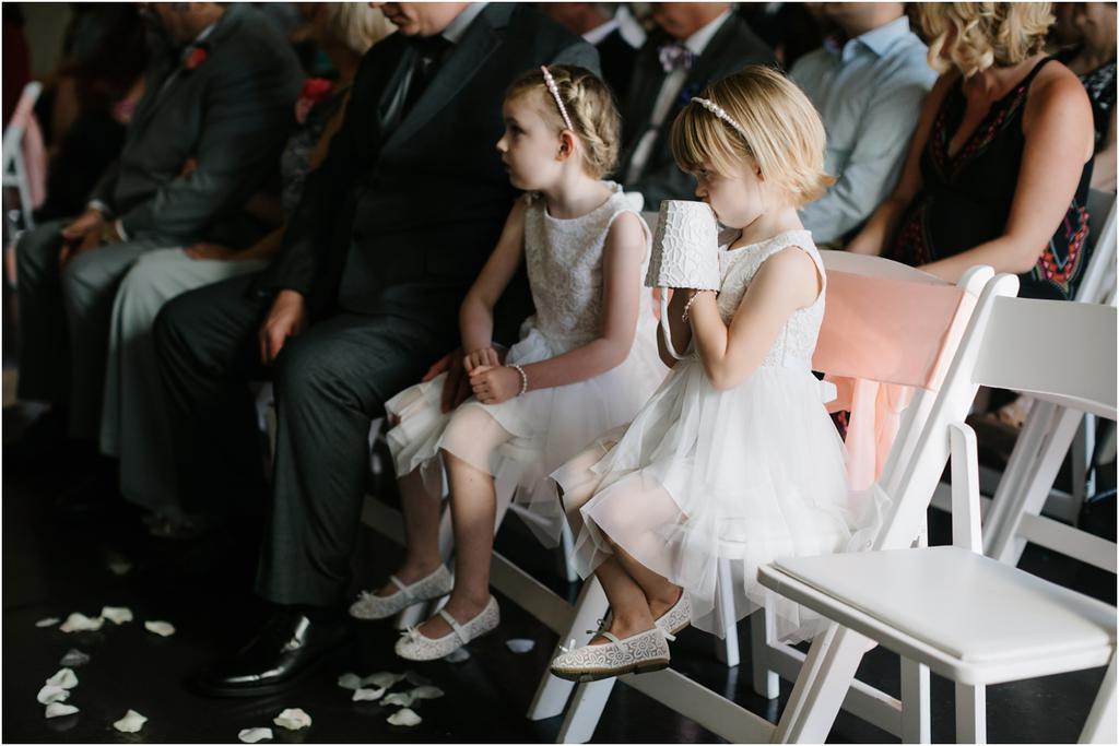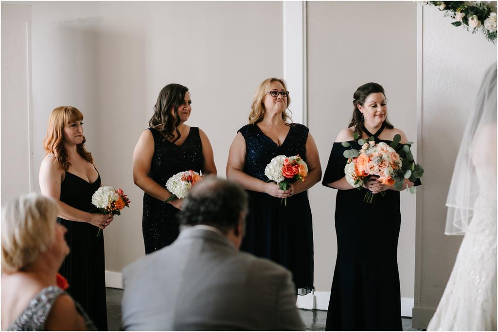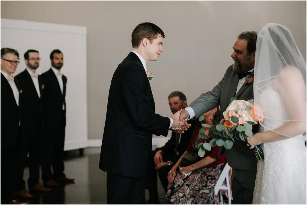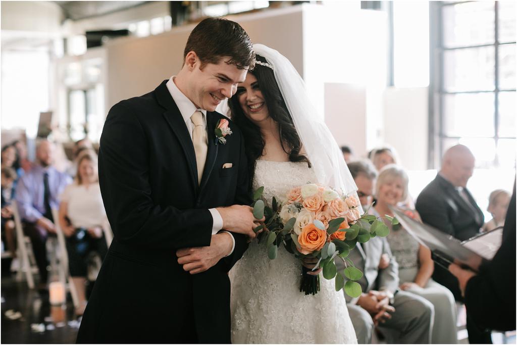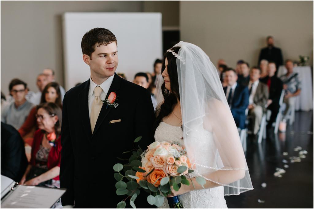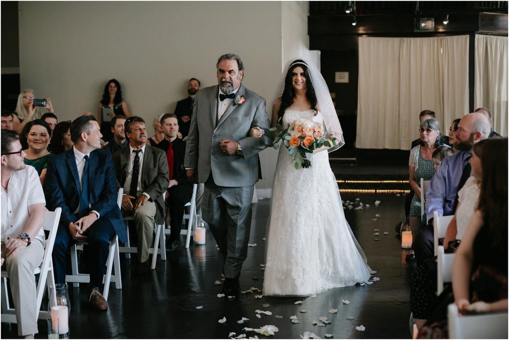 It was a HOT Thursday afternoon in downtown Portland. The temperatures were in the upper-90s outside, but Adam and Cece’s Urban Studio wedding was nice and cool indoors. I’ve never been so happy to photograph an indoor wedding in my life haha. Especially at a venue as beautiful as this one! Adam and Cece envisioned their Portland Urban Studio wedding as modern, formal and metropolitan. Their decor was minimal but gorgeous โ focusing on the clean, industrial lines of the space with a few soft pink and coral florals to balance it out. The result was classic and timeless and it suited them perfectly. Something I loved about this wedding was the subtle intimacy between Adam and Cece throughout the evening. When I asked them what mattered most to them during the day, those little moments were hands down the most important to them. They wanted to remember the way that they looked at each other that night. The stolen glances. The big smiles and the tears. All of it.