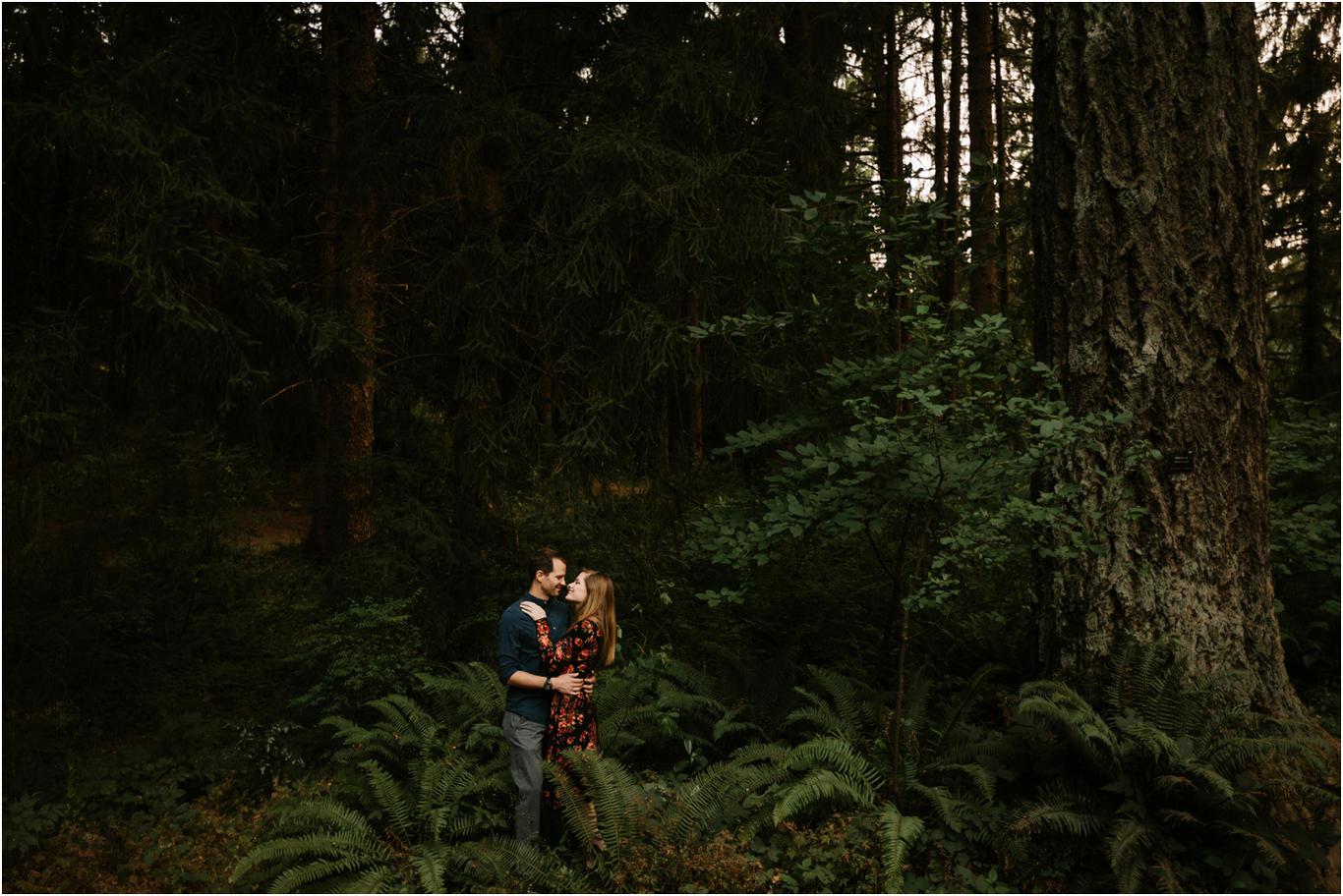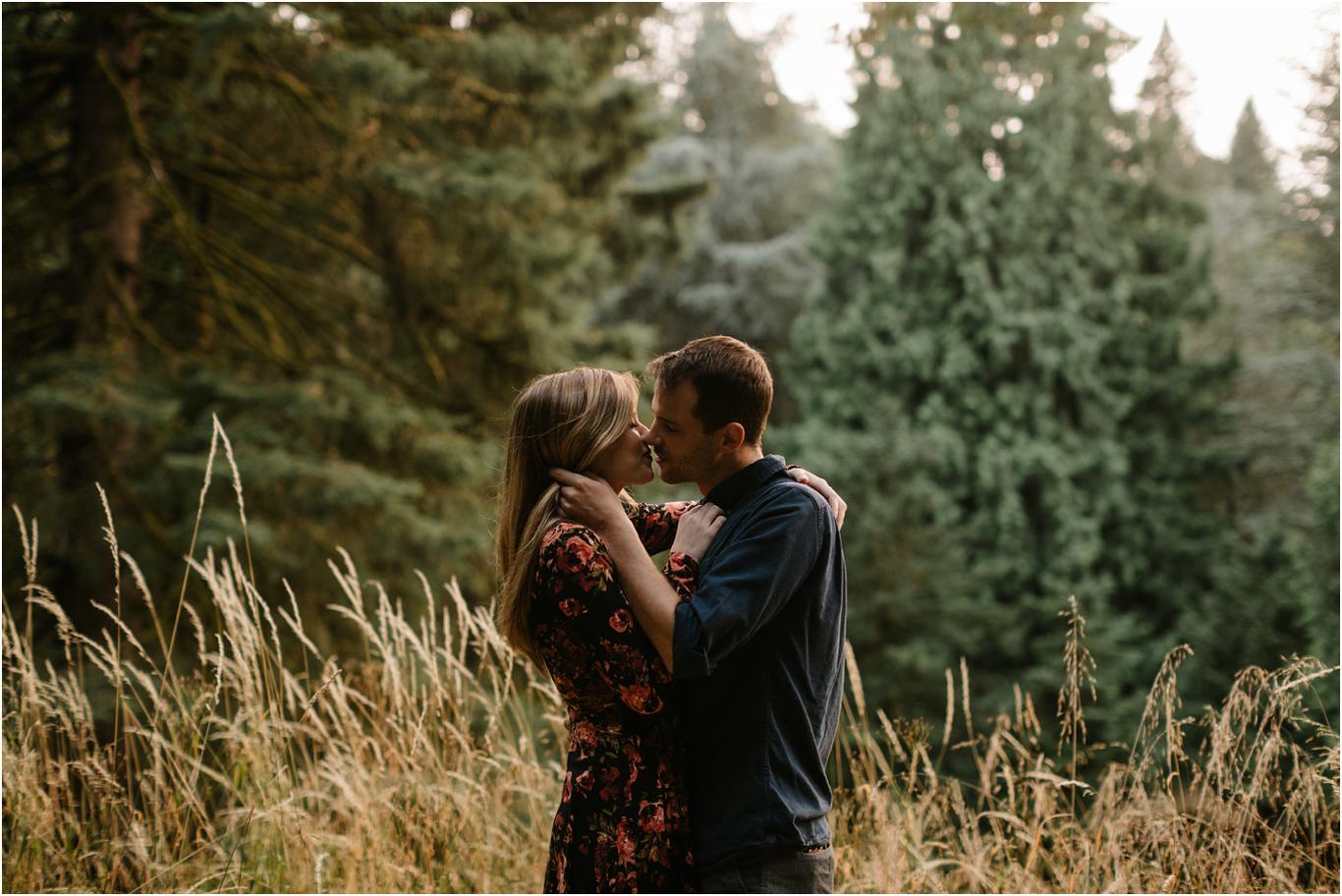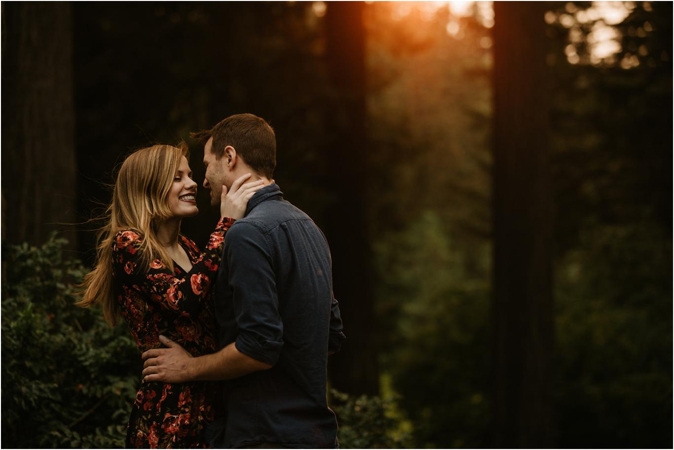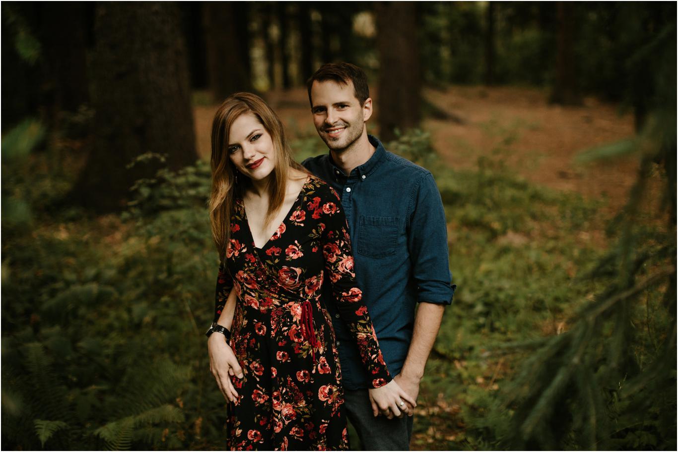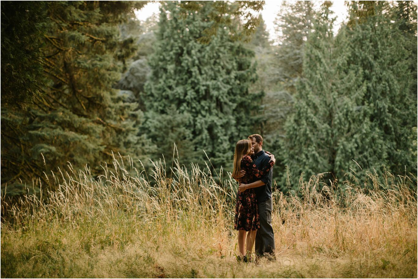 I took these Hoyt Arboretum engagement photos back in August when Portland was still floating in a sea of smoke. The orange light had a peculiar, otherworldly quality. While it bugged me, it also inspired me. I loved the way the light washed over Natasha’s golden hair, bringing out the rich beauty of it. I loved the warm pockets it created in the forest. I despise the destruction the fires cause and the pain they bring to my lungs, but there is still beauty in all of it. And these Hoyt Arboretum engagement photos show it off perfectly. Something I love about Hoyt is how it can photograph either light and airy, or very dark and moody. It depends entirely on where you take the photos and how you use light. I love that there are so many beautiful options in one place. Natasha and Preston told me that when they first met, they actually disliked each other. It was one of those relationships that began with strong emotions, and those strong emotions went from negative to positive. Now they have a beautiful, confident love and I am stoked to photograph their Oregon wedding reception in a few months