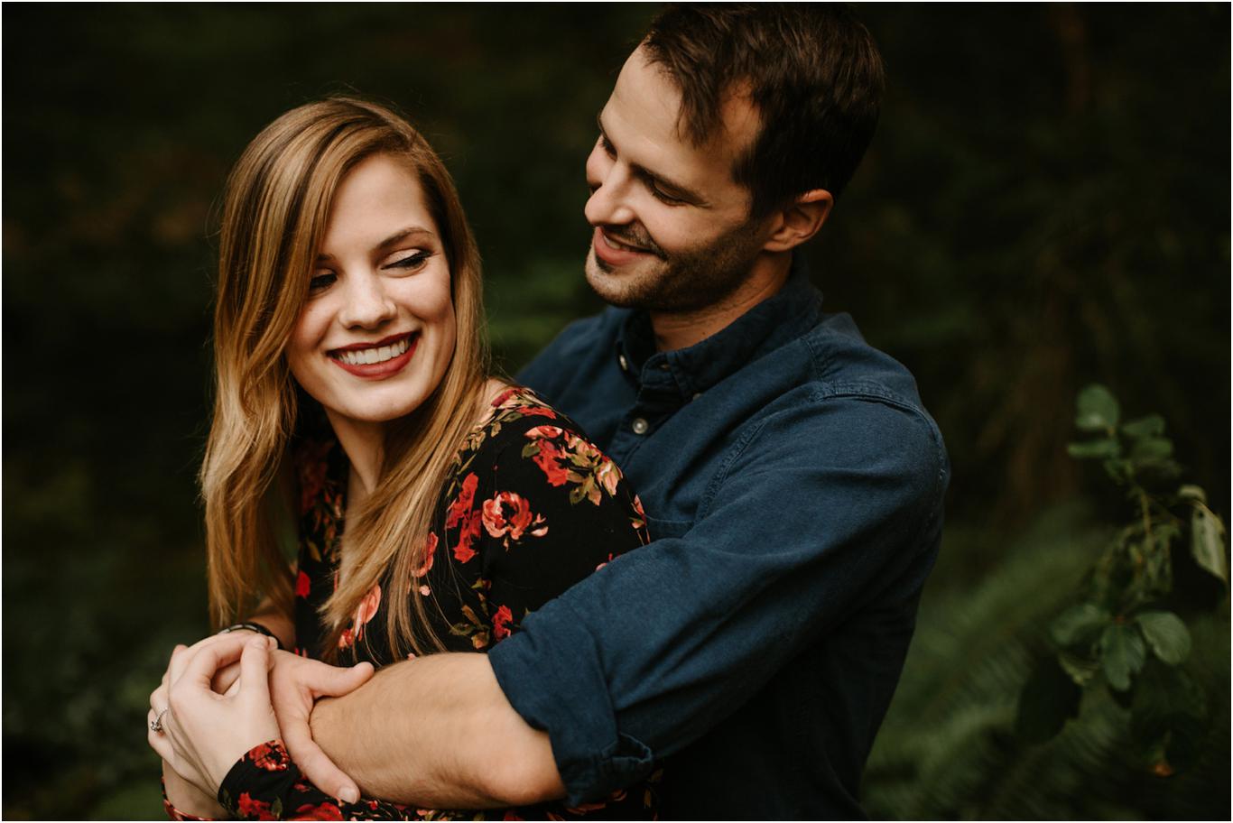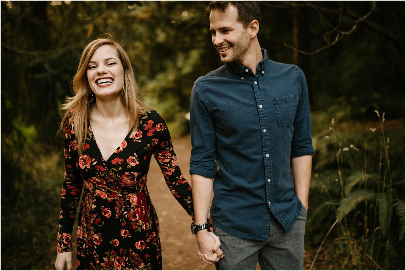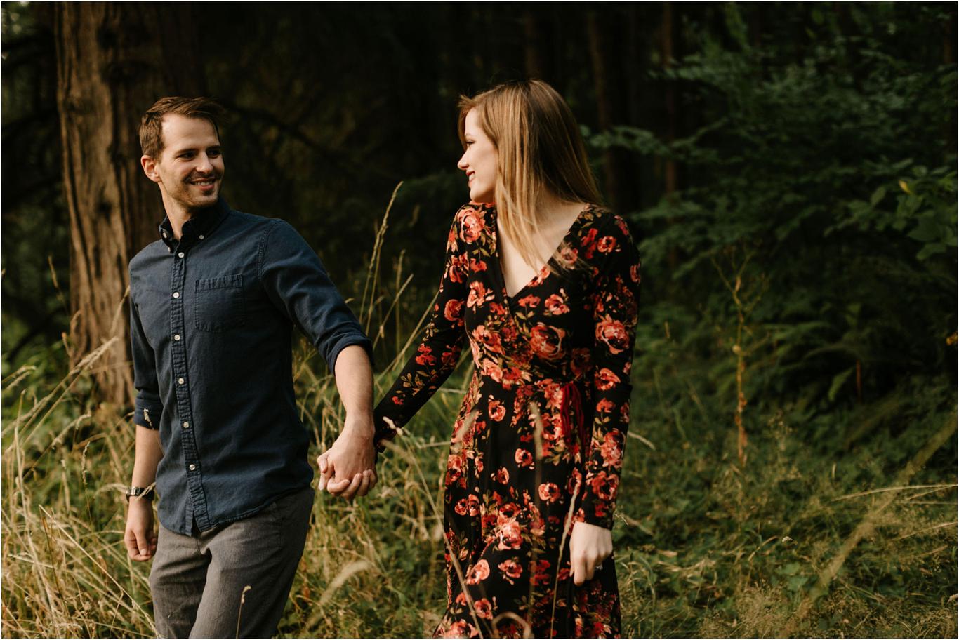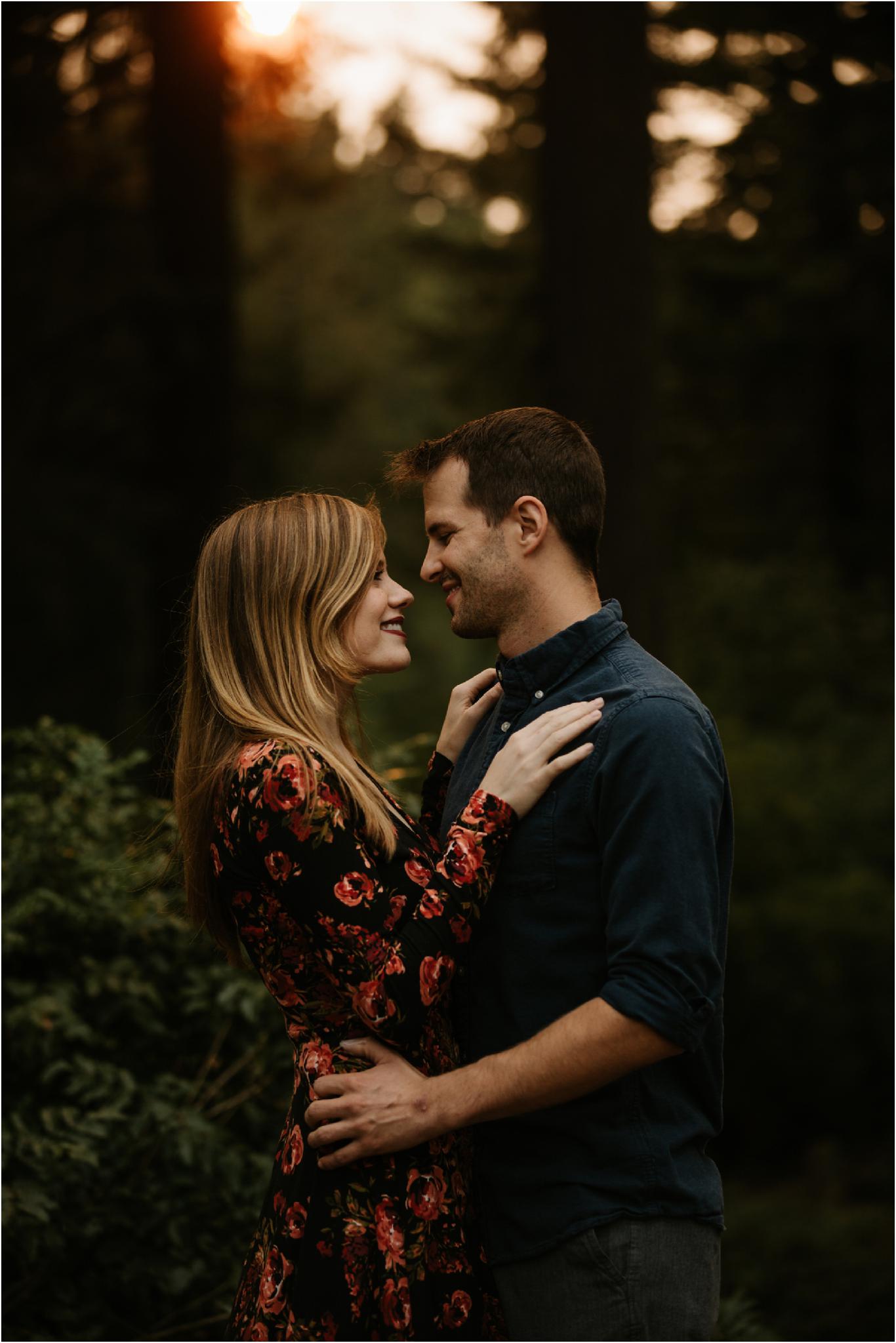 I took these Hoyt Arboretum engagement photos back in August when Portland was still floating in a sea of smoke. The orange light had a peculiar, otherworldly quality. While it bugged me, it also inspired me. I loved the way the light washed over Natasha’s golden hair, bringing out the rich beauty of it. I loved the warm pockets it created in the forest. I despise the destruction the fires cause and the pain they bring to my lungs, but there is still beauty in all of it. And these Hoyt Arboretum engagement photos show it off perfectly. Something I love about Hoyt is how it can photograph either light and airy, or very dark and moody. It depends entirely on where you take the photos and how you use light. I love that there are so many beautiful options in one place. Natasha and Preston told me that when they first met, they actually disliked each other. It was one of those relationships that began with strong emotions, and those strong emotions went from negative to positive. Now they have a beautiful, confident love and I am stoked to photograph their Oregon wedding reception in a few months