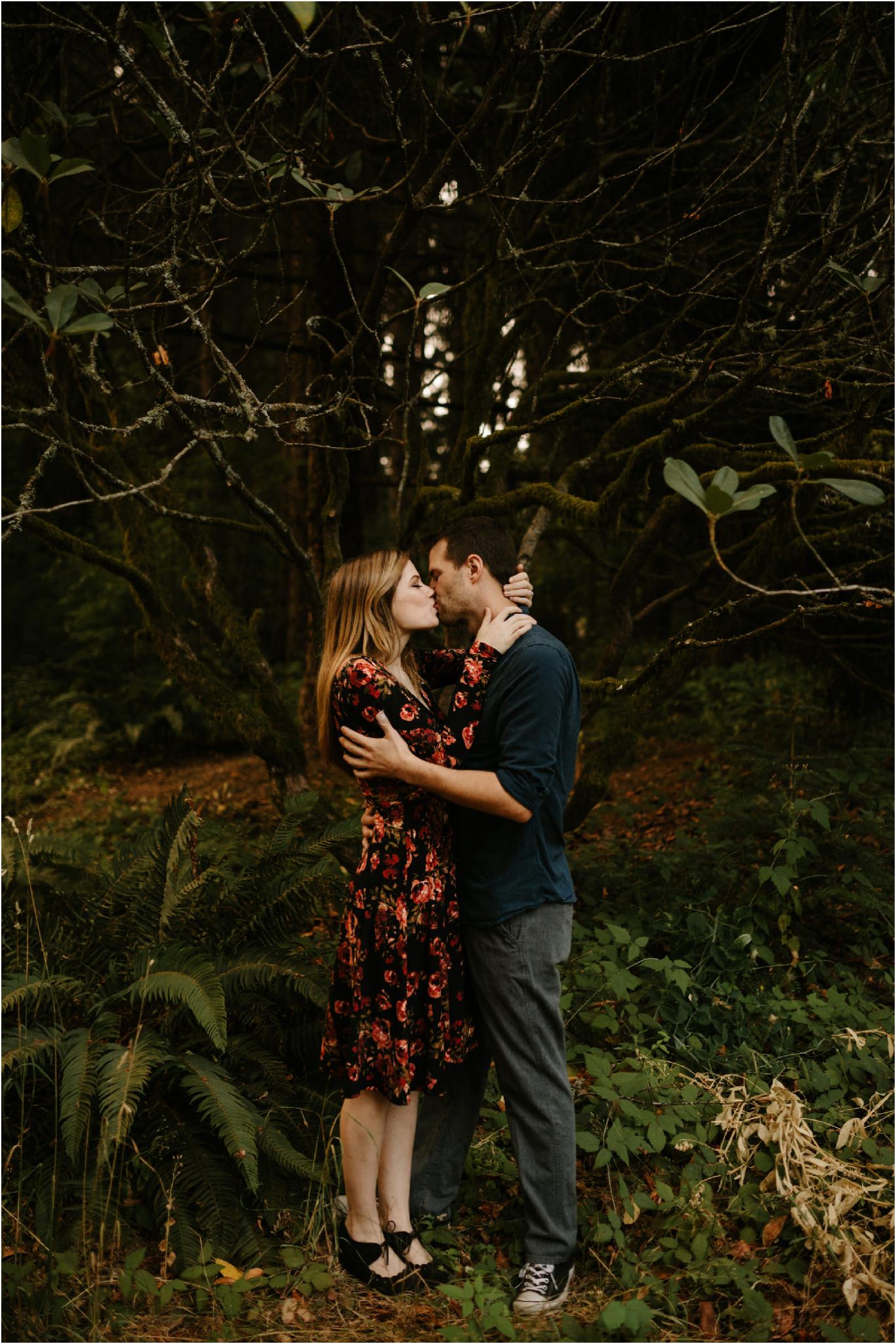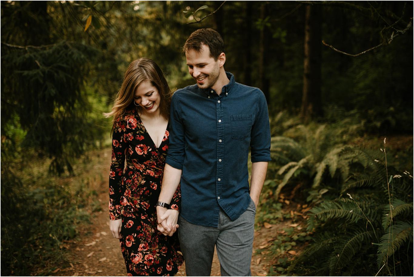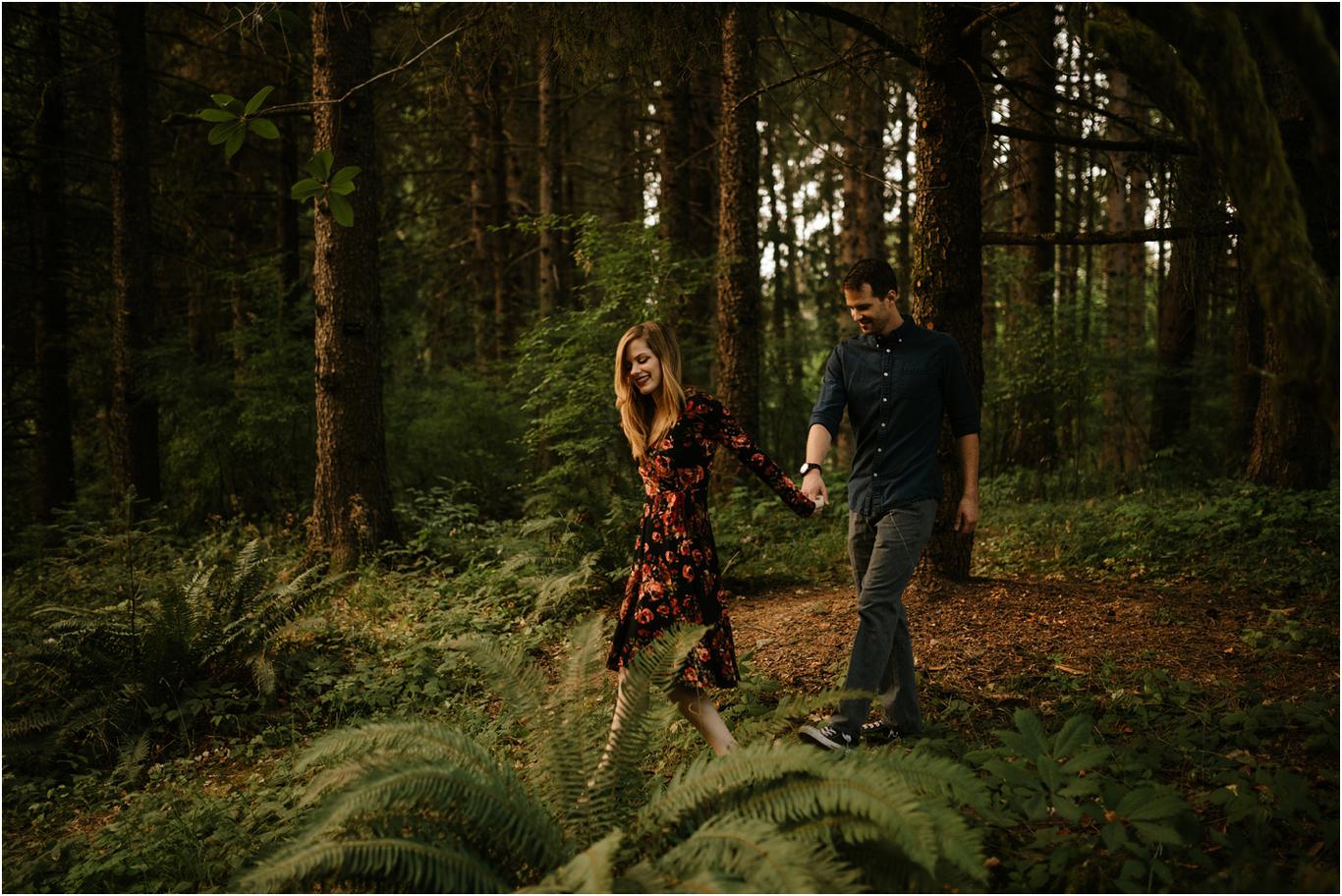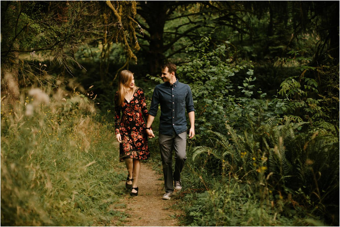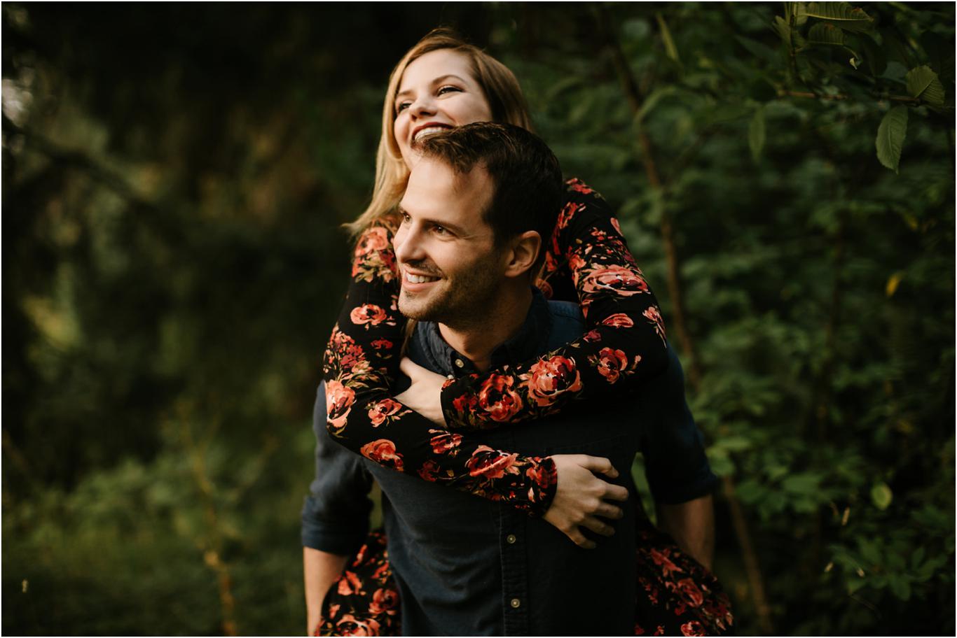 I took these Hoyt Arboretum engagement photos back in August when Portland was still floating in a sea of smoke. The orange light had a peculiar, otherworldly quality. While it bugged me, it also inspired me. I loved the way the light washed over Natasha’s golden hair, bringing out the rich beauty of it. I loved the warm pockets it created in the forest. I despise the destruction the fires cause and the pain they bring to my lungs, but there is still beauty in all of it. And these Hoyt Arboretum engagement photos show it off perfectly. Something I love about Hoyt is how it can photograph either light and airy, or very dark and moody. It depends entirely on where you take the photos and how you use light. I love that there are so many beautiful options in one place. Natasha and Preston told me that when they first met, they actually disliked each other. It was one of those relationships that began with strong emotions, and those strong emotions went from negative to positive. Now they have a beautiful, confident love and I am stoked to photograph their Oregon wedding reception in a few months