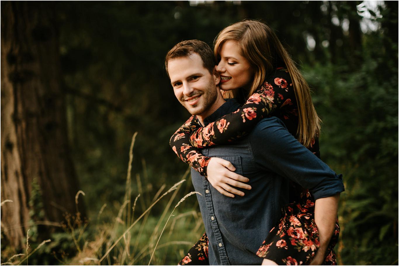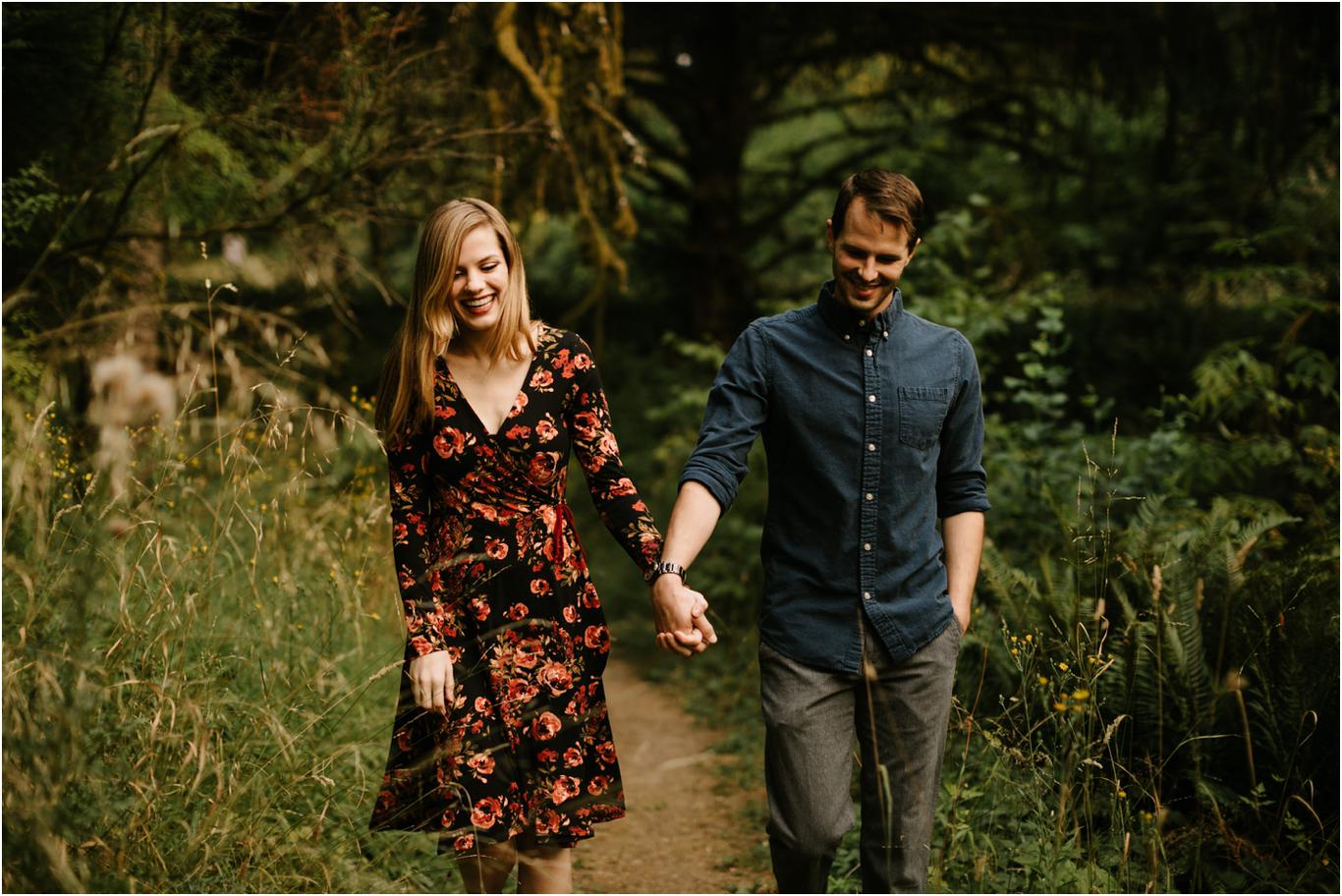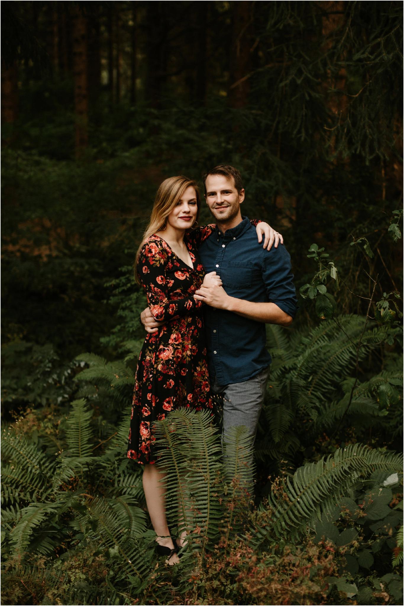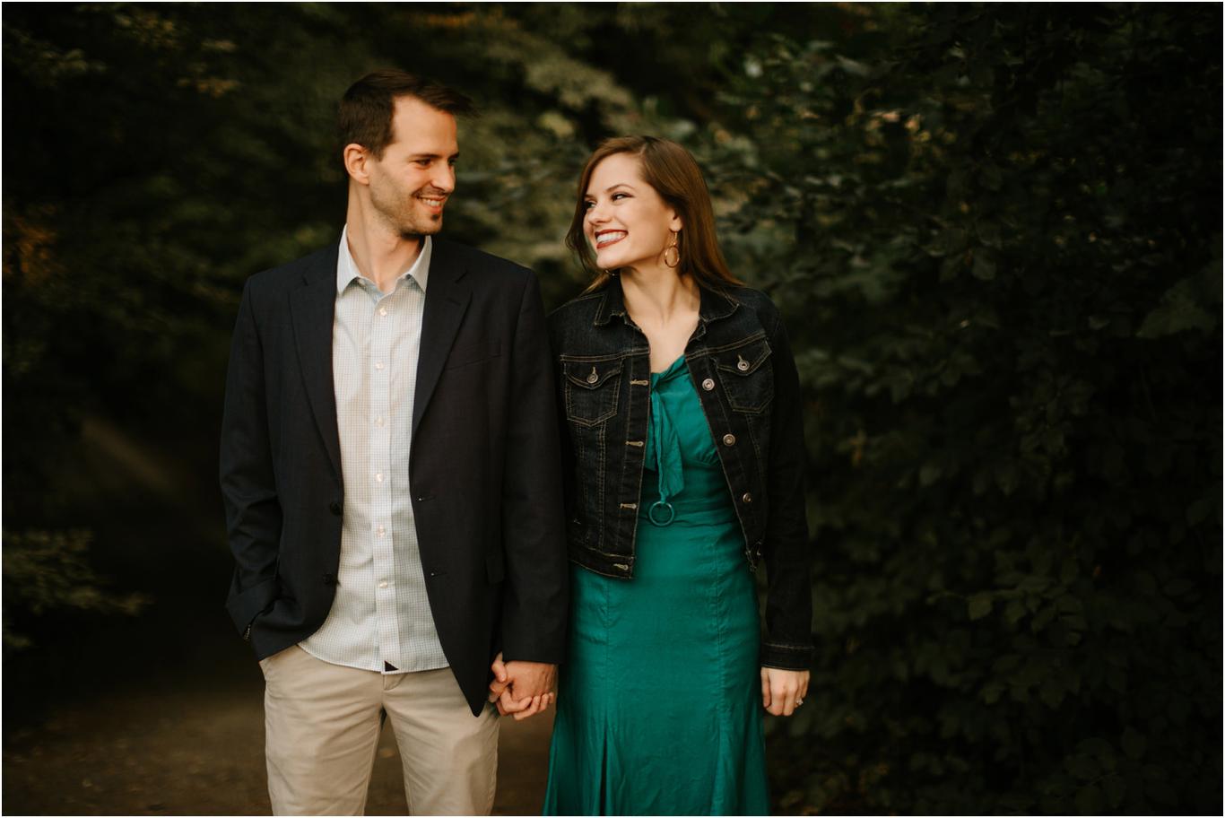 I took these Hoyt Arboretum engagement photos back in August when Portland was still floating in a sea of smoke. The orange light had a peculiar, otherworldly quality. While it bugged me, it also inspired me. I loved the way the light washed over Natasha’s golden hair, bringing out the rich beauty of it. I loved the warm pockets it created in the forest. I despise the destruction the fires cause and the pain they bring to my lungs, but there is still beauty in all of it. And these Hoyt Arboretum engagement photos show it off perfectly. Something I love about Hoyt is how it can photograph either light and airy, or very dark and moody. It depends entirely on where you take the photos and how you use light. I love that there are so many beautiful options in one place. Natasha and Preston told me that when they first met, they actually disliked each other. It was one of those relationships that began with strong emotions, and those strong emotions went from negative to positive. Now they have a beautiful, confident love and I am stoked to photograph their Oregon wedding reception in a few months