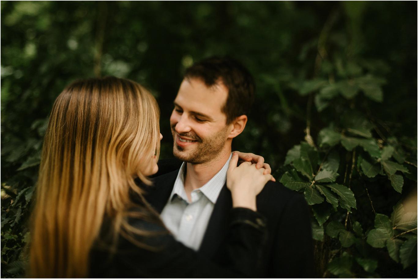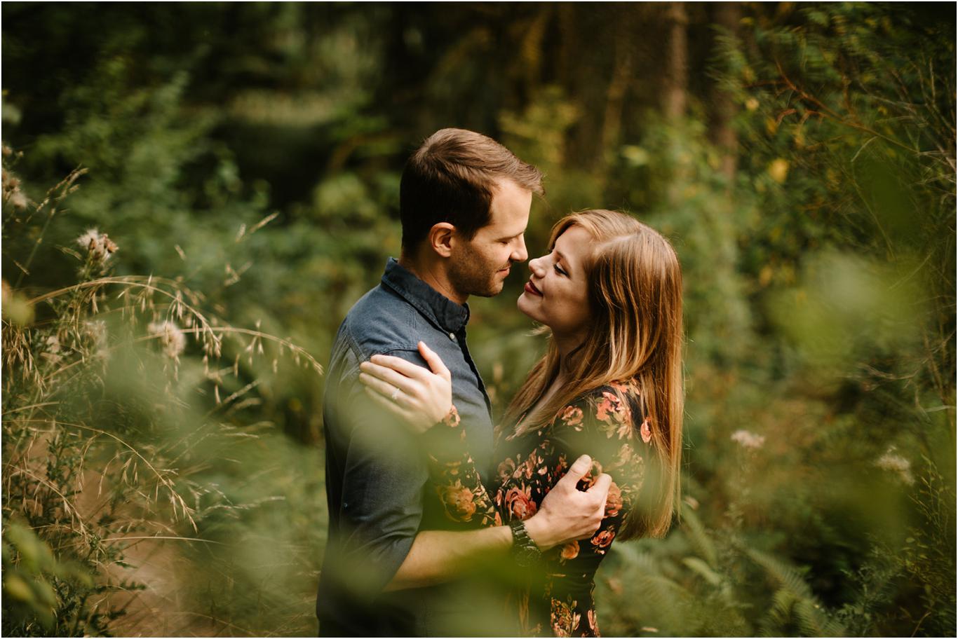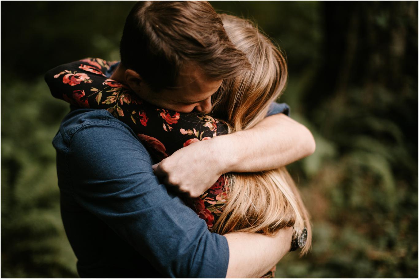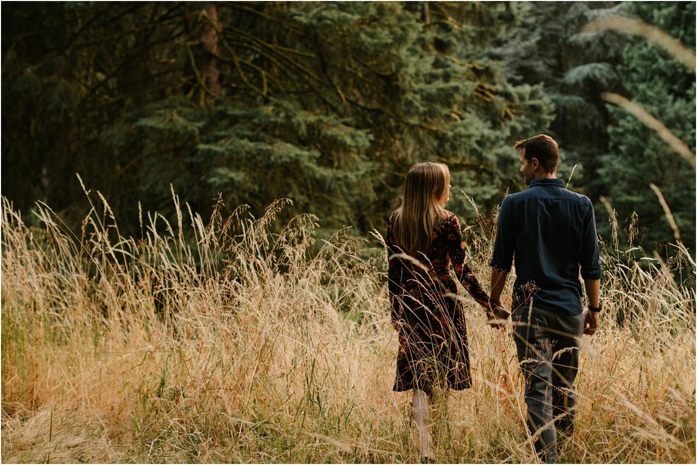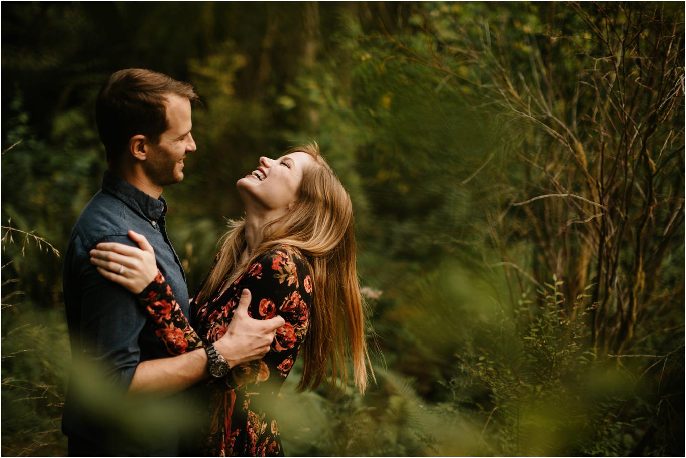 I took these Hoyt Arboretum engagement photos back in August when Portland was still floating in a sea of smoke. The orange light had a peculiar, otherworldly quality. While it bugged me, it also inspired me. I loved the way the light washed over Natasha’s golden hair, bringing out the rich beauty of it. I loved the warm pockets it created in the forest. I despise the destruction the fires cause and the pain they bring to my lungs, but there is still beauty in all of it. And these Hoyt Arboretum engagement photos show it off perfectly. Something I love about Hoyt is how it can photograph either light and airy, or very dark and moody. It depends entirely on where you take the photos and how you use light. I love that there are so many beautiful options in one place. Natasha and Preston told me that when they first met, they actually disliked each other. It was one of those relationships that began with strong emotions, and those strong emotions went from negative to positive. Now they have a beautiful, confident love and I am stoked to photograph their Oregon wedding reception in a few months