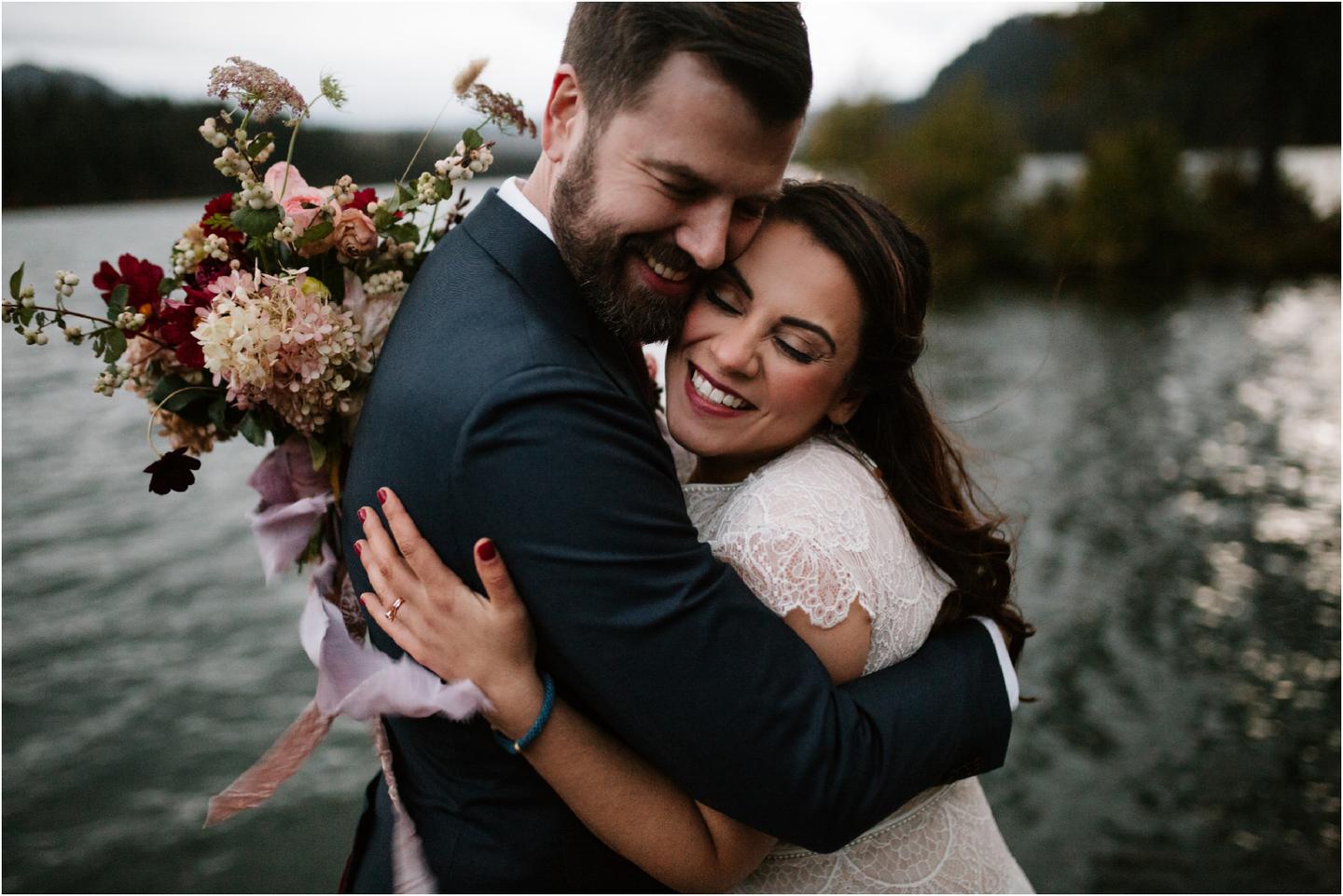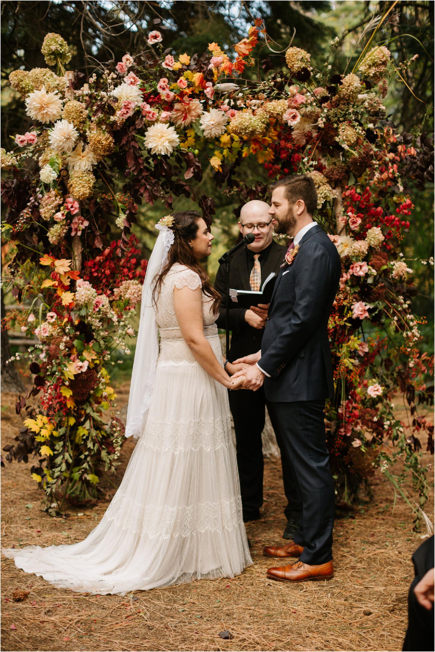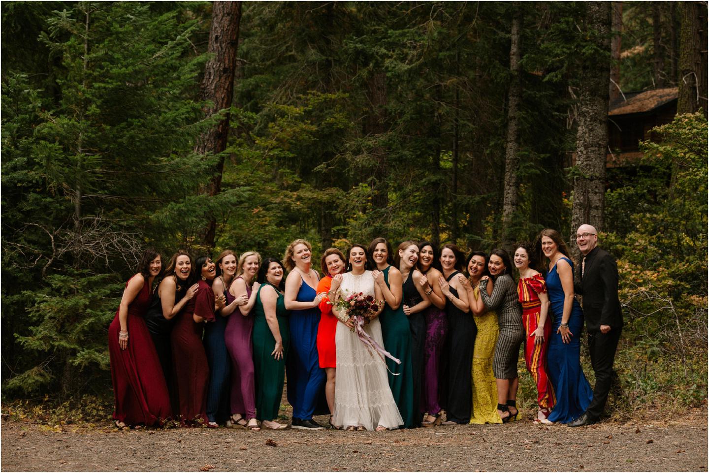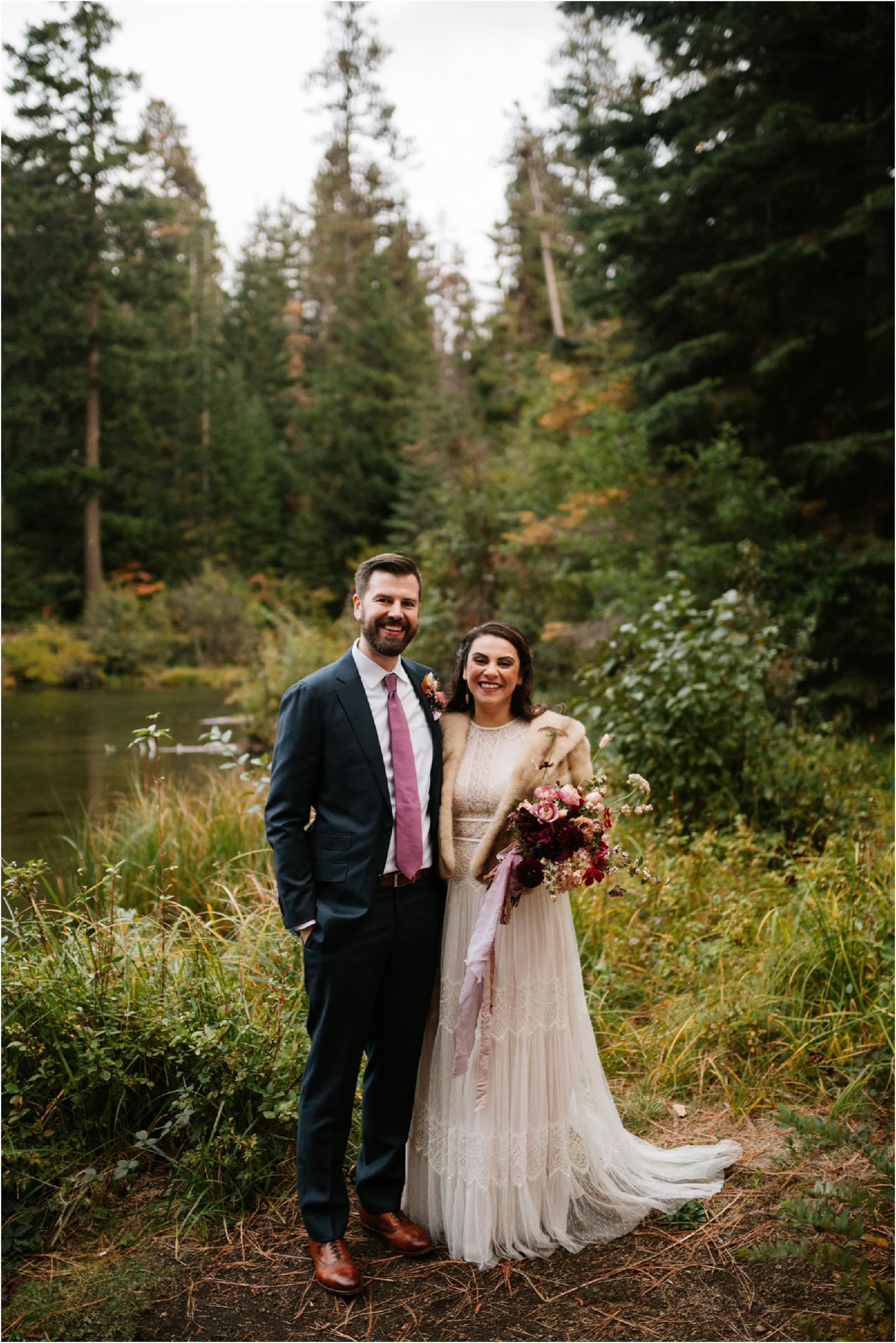 Jim and Candice became good friends and fell in love while wandering around the Pacific Northwest. They loved Oregon and wanted to have their wedding in a place with stunning natural beauty in the forest. My kinda people! They decided to have a Suttle Lake Lodge wedding because of its rustic but modern vibe, plus it’s epic lakefront views. They loved that the entire place was an outdoor playground. They felt like their guests could have a weekend-long experience in their outdoors, complete with hiking, campfires, kayaking and cozy cabin vibes. Candice and Jim decided not to have bridesmaids or groomsmen, but instead asked all their closest friends to wear bold jewel tones. The group photo looked SO awesome and it was such a great way to include friends without the stress of a huge bridal party! The thing I loved MOST about the entire weekend wasn’t the stunning fall colors, the gorgeous venue, the epic flowers, or the tasty food. It was Candice and Jim themselves. Their kindness was incredible. Since they found my work online in early 2017, Candice and Jim went from being complete strangers to people who are honestly my friends. I love Candice’s warm and lively personality and how it compliments Jim’s quieter side. I love how smart they both are and how passionate they are about everything they do. They are welcoming, friendly, and fun. Getting to know them has been such a blessing in my life!
