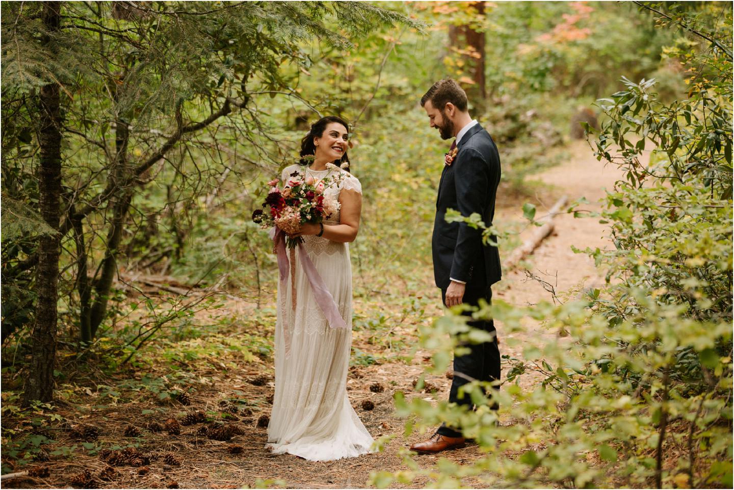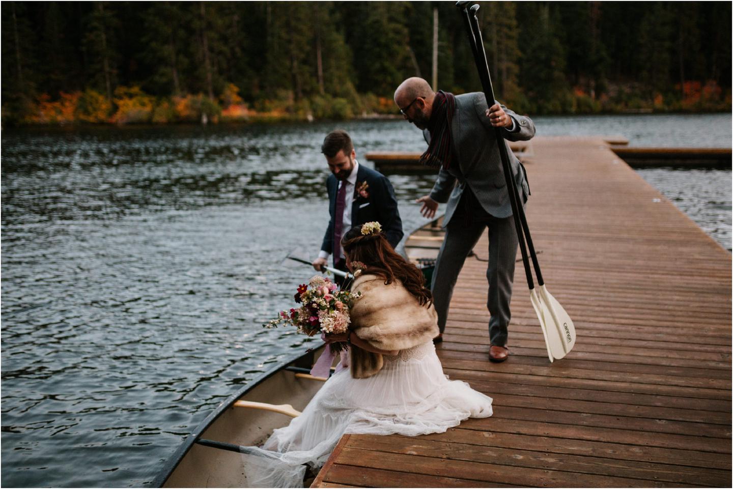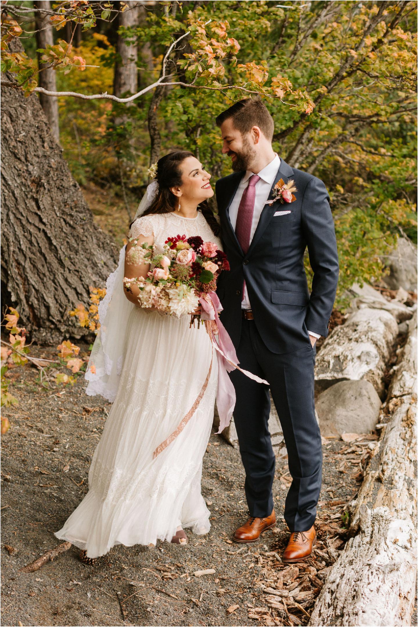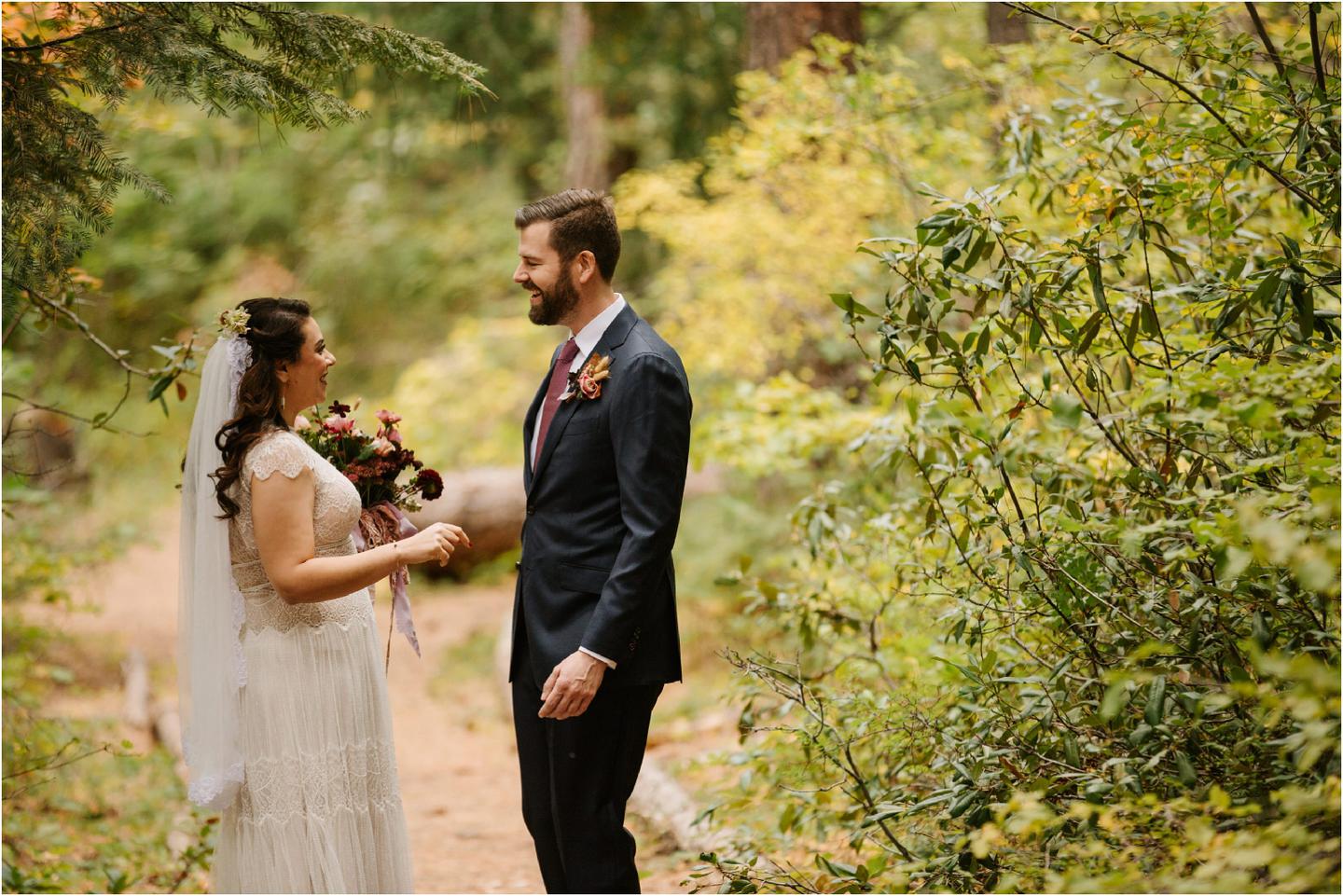 Jim and Candice became good friends and fell in love while wandering around the Pacific Northwest. They loved Oregon and wanted to have their wedding in a place with stunning natural beauty in the forest. My kinda people! They decided to have a Suttle Lake Lodge wedding because of its rustic but modern vibe, plus it’s epic lakefront views. They loved that the entire place was an outdoor playground. They felt like their guests could have a weekend-long experience in their outdoors, complete with hiking, campfires, kayaking and cozy cabin vibes. Candice and Jim decided not to have bridesmaids or groomsmen, but instead asked all their closest friends to wear bold jewel tones. The group photo looked SO awesome and it was such a great way to include friends without the stress of a huge bridal party! The thing I loved MOST about the entire weekend wasn’t the stunning fall colors, the gorgeous venue, the epic flowers, or the tasty food. It was Candice and Jim themselves. Their kindness was incredible. Since they found my work online in early 2017, Candice and Jim went from being complete strangers to people who are honestly my friends. I love Candice’s warm and lively personality and how it compliments Jim’s quieter side. I love how smart they both are and how passionate they are about everything they do. They are welcoming, friendly, and fun. Getting to know them has been such a blessing in my life!