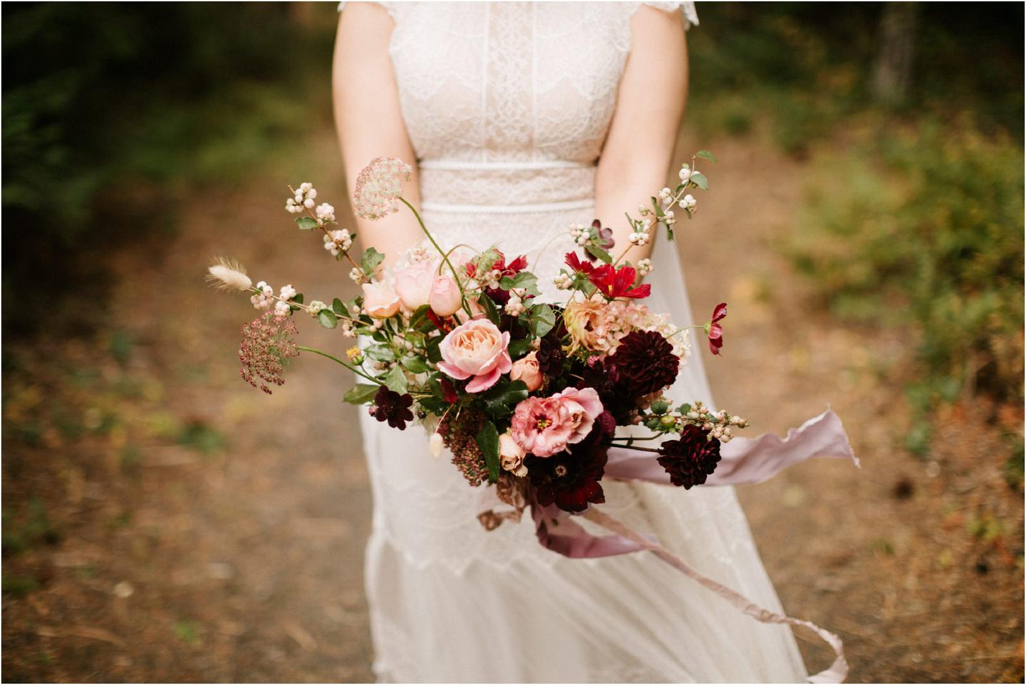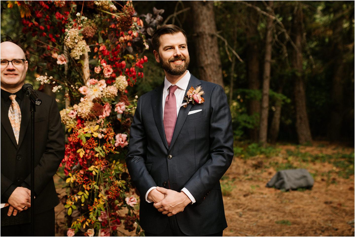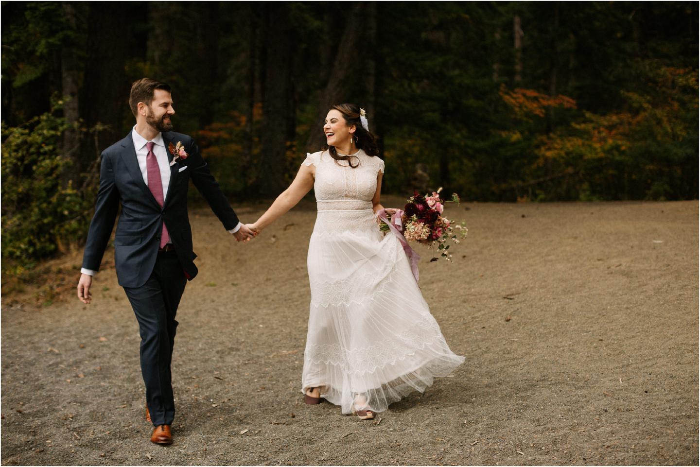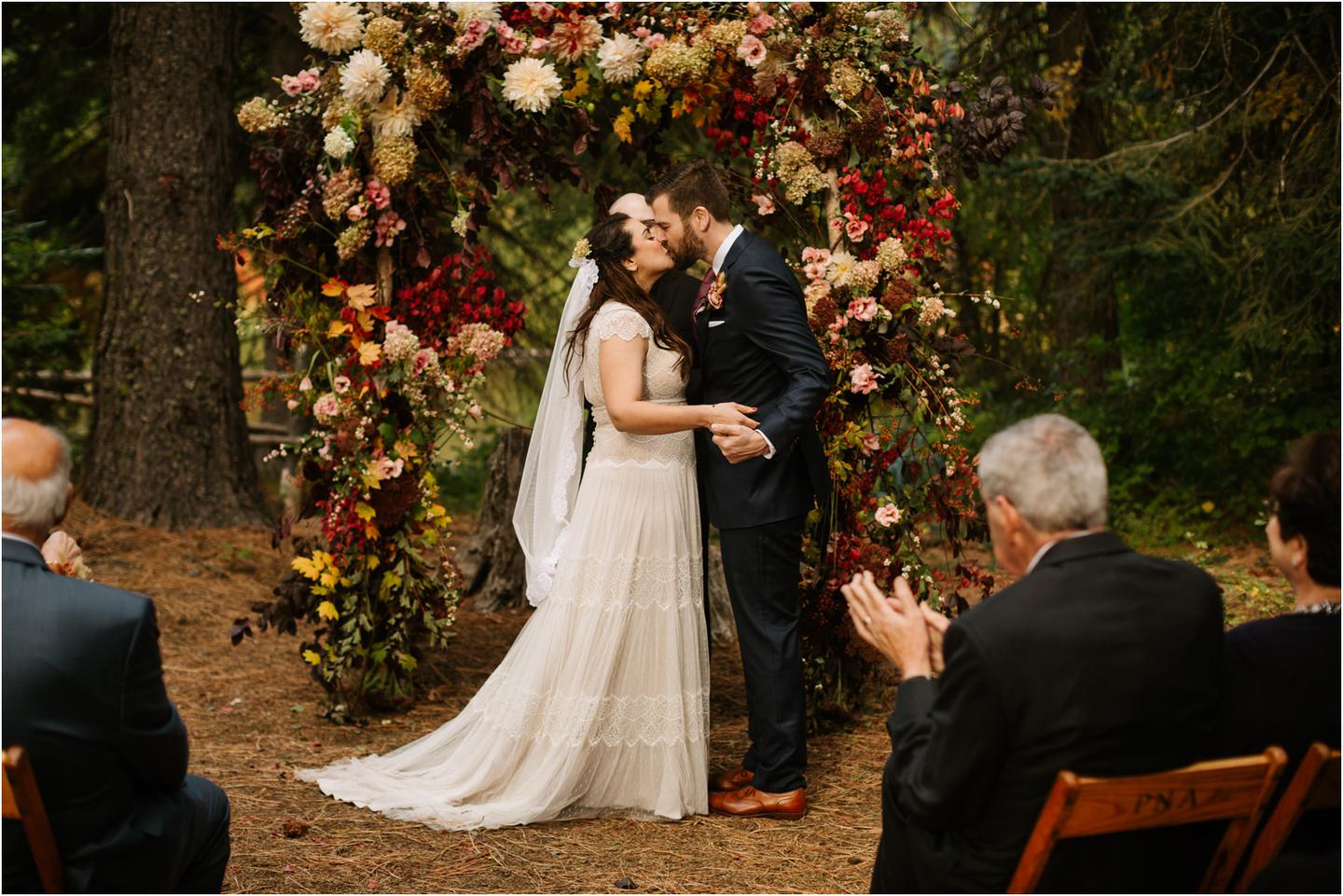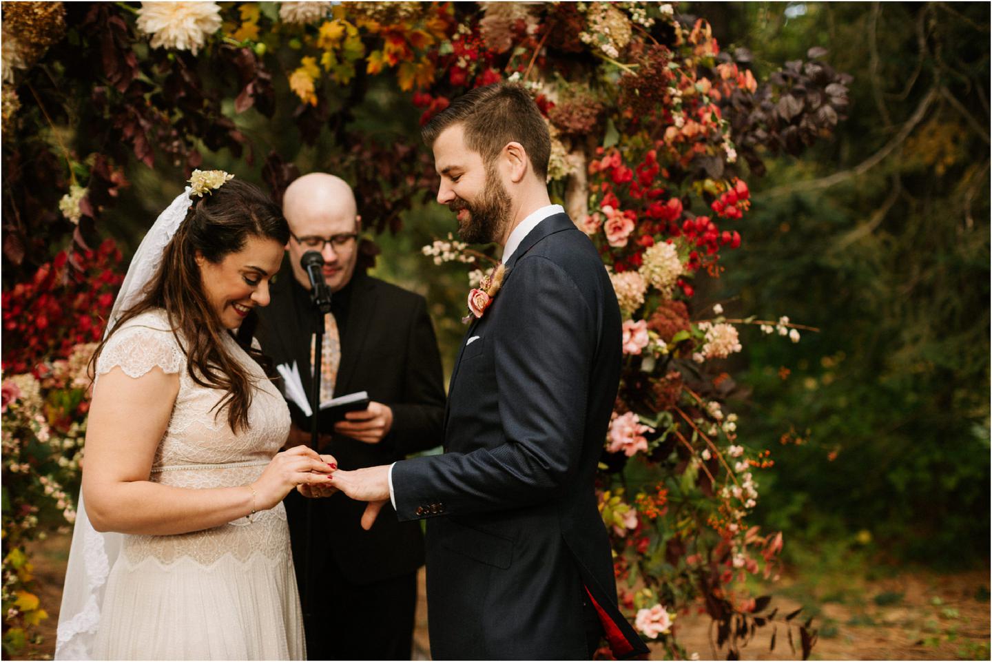 Jim and Candice became good friends and fell in love while wandering around the Pacific Northwest. They loved Oregon and wanted to have their wedding in a place with stunning natural beauty in the forest. My kinda people! They decided to have a Suttle Lake Lodge wedding because of its rustic but modern vibe, plus it’s epic lakefront views. They loved that the entire place was an outdoor playground. They felt like their guests could have a weekend-long experience in their outdoors, complete with hiking, campfires, kayaking and cozy cabin vibes. Candice and Jim decided not to have bridesmaids or groomsmen, but instead asked all their closest friends to wear bold jewel tones. The group photo looked SO awesome and it was such a great way to include friends without the stress of a huge bridal party! The thing I loved MOST about the entire weekend wasn’t the stunning fall colors, the gorgeous venue, the epic flowers, or the tasty food. It was Candice and Jim themselves. Their kindness was incredible. Since they found my work online in early 2017, Candice and Jim went from being complete strangers to people who are honestly my friends. I love Candice’s warm and lively personality and how it compliments Jim’s quieter side. I love how smart they both are and how passionate they are about everything they do. They are welcoming, friendly, and fun. Getting to know them has been such a blessing in my life!